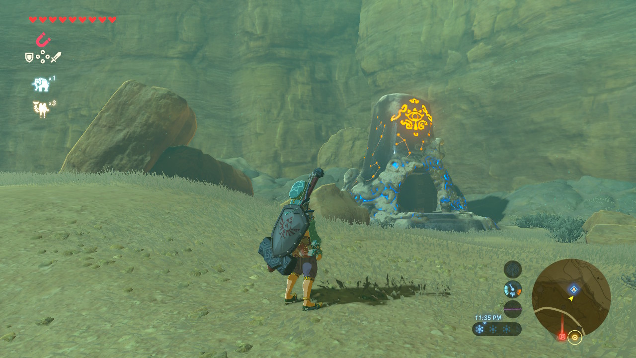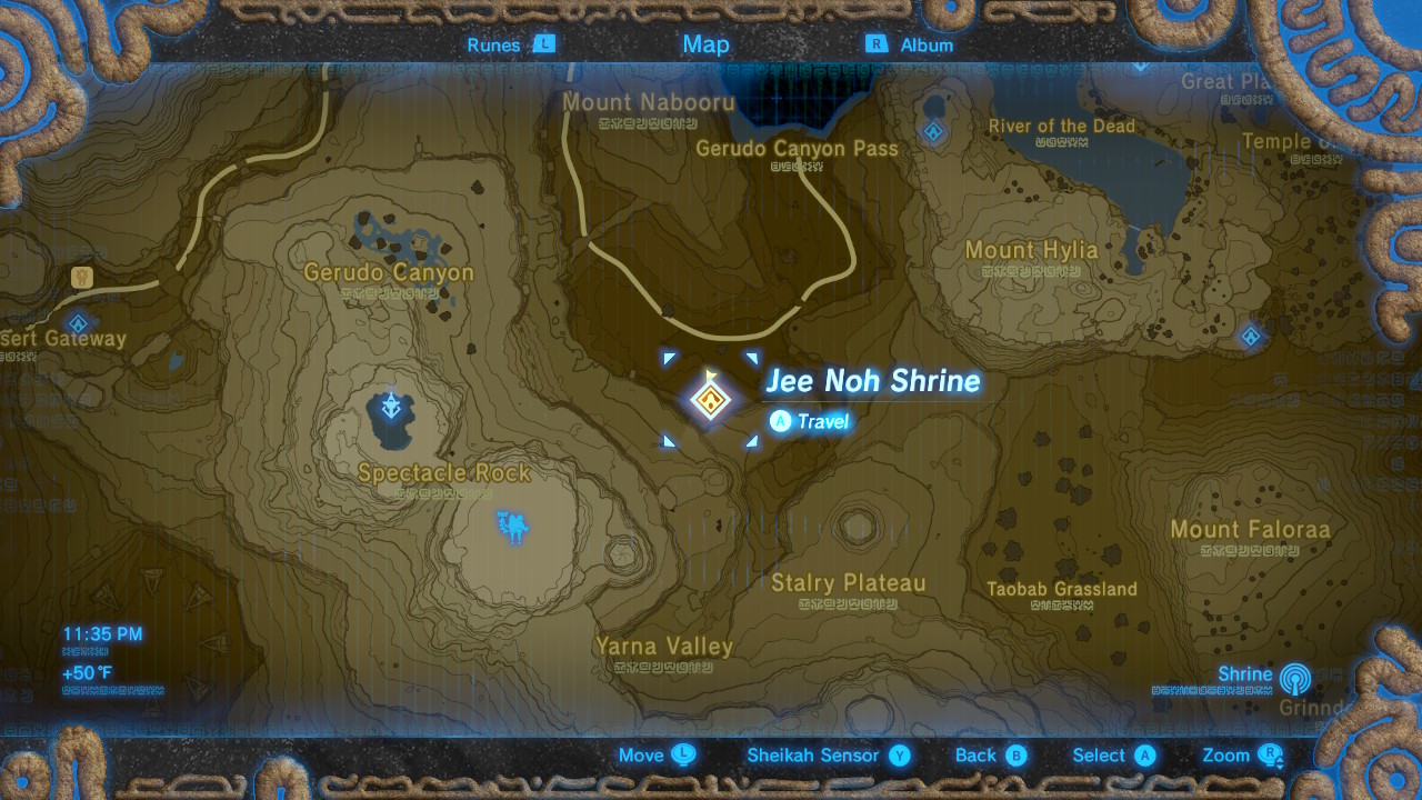 Found on the main road from the Central Tower Region into the Wasteland Tower Region. If you start from the abandoned outpost near the Great Plateau, follow the road west to encounter this shrine in the dusty canyons. It’s on Gerudo Canyon Pass, around ground level, and south of Mount Nabooru.