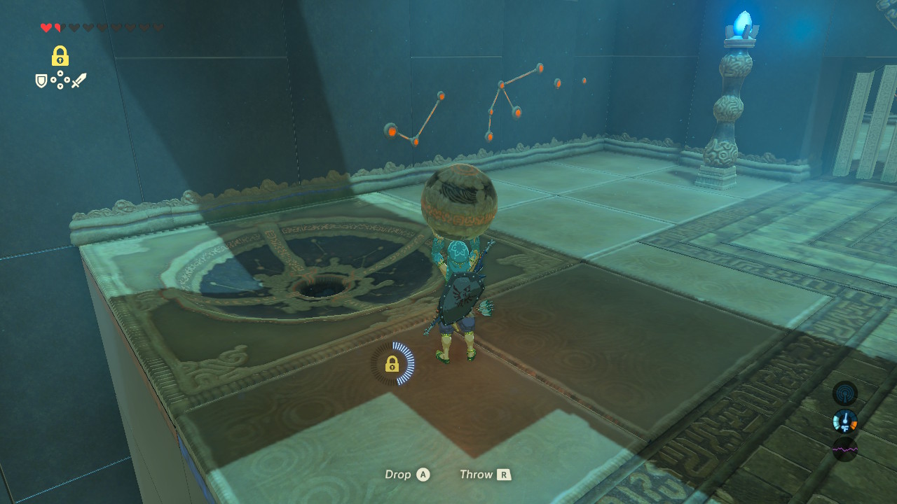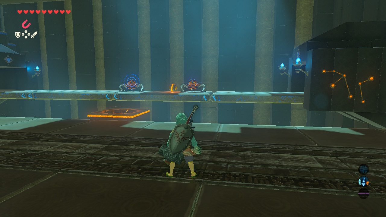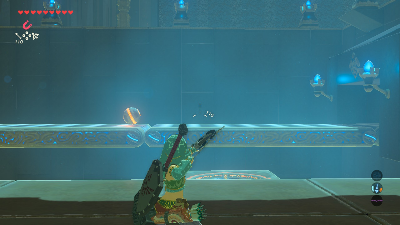 The second chamber presents a similar problem, only with two Scout Guardians. Link can continue to move while aiming, so as long as you stay on the move, you can tag the orb and drop it into the funnel without bothering with the Guardians. If you do destroy the Guardians, they won’t respawn.