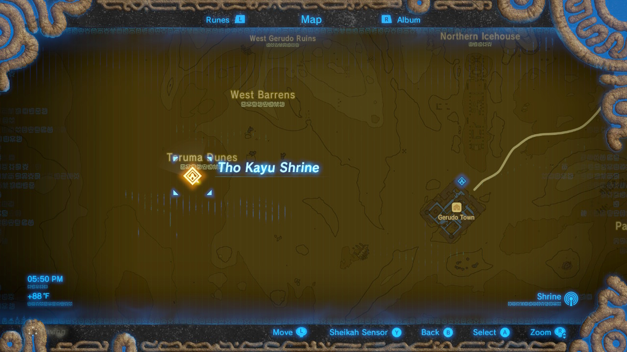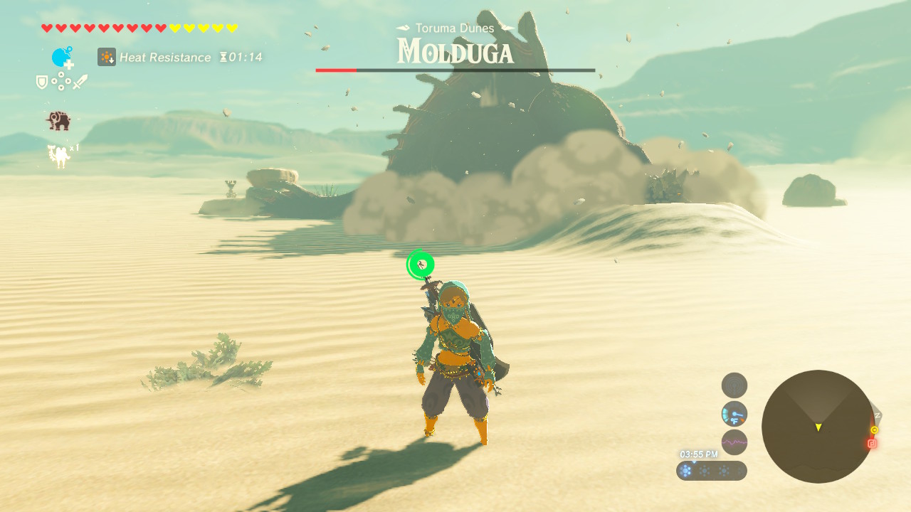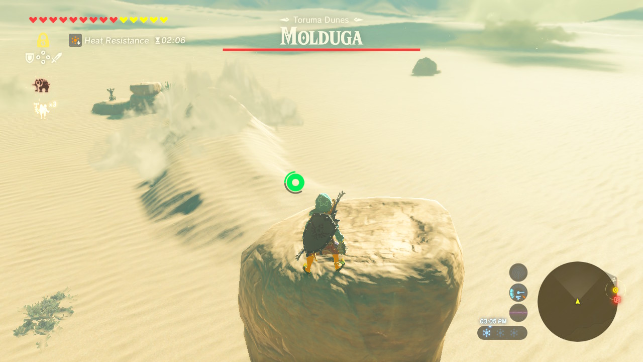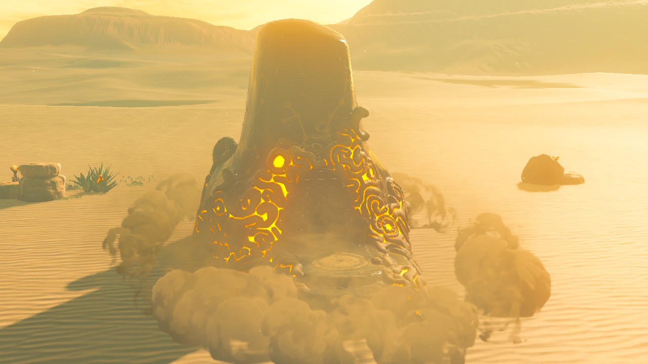 This shrine is found far west in the Toruma Dunes. A fearsome Molduga monster makes this area its home. To reach the shrine it’s probably a good idea to kill this thing. It detects Link through vibrations in the sand, so best to stay on the rocks while this monster is on the prowl.