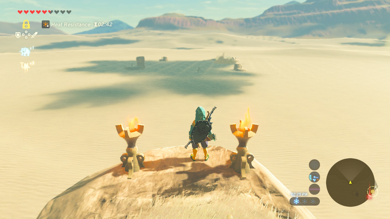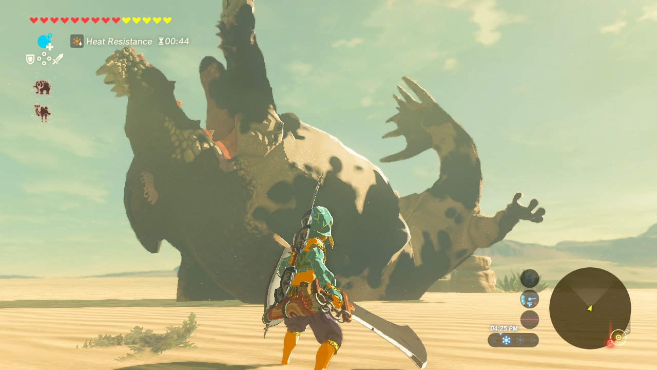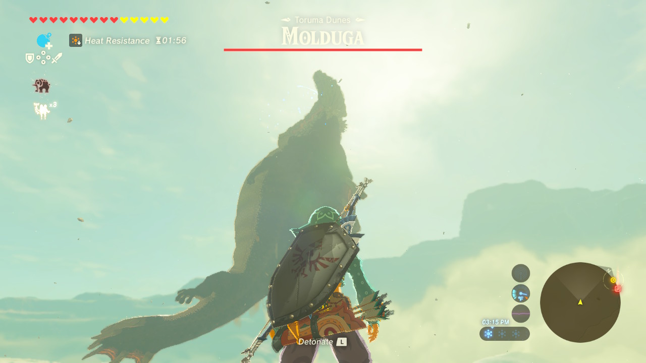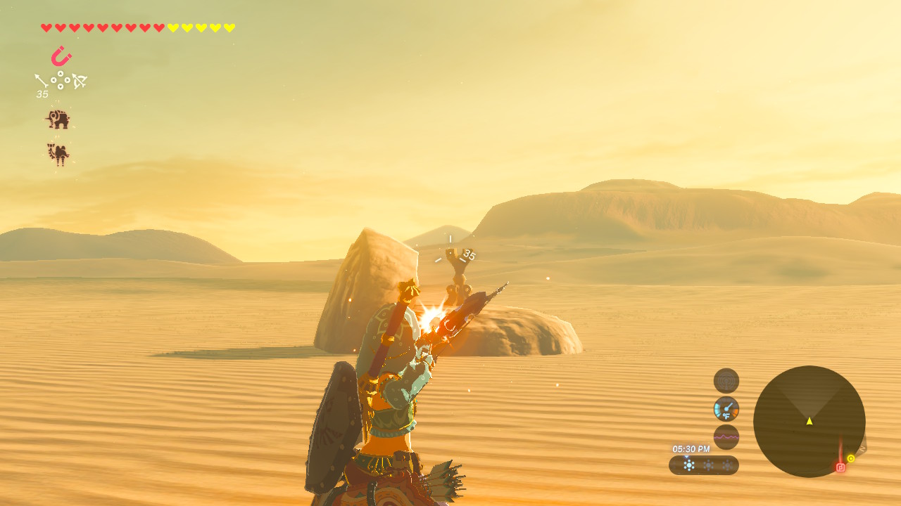 This shrine is found far west in the Toruma Dunes. A fearsome Molduga monster makes this area its home. To reach the shrine it’s probably a good idea to kill this thing. It detects Link through vibrations in the sand, so best to stay on the rocks while this monster is on the prowl.