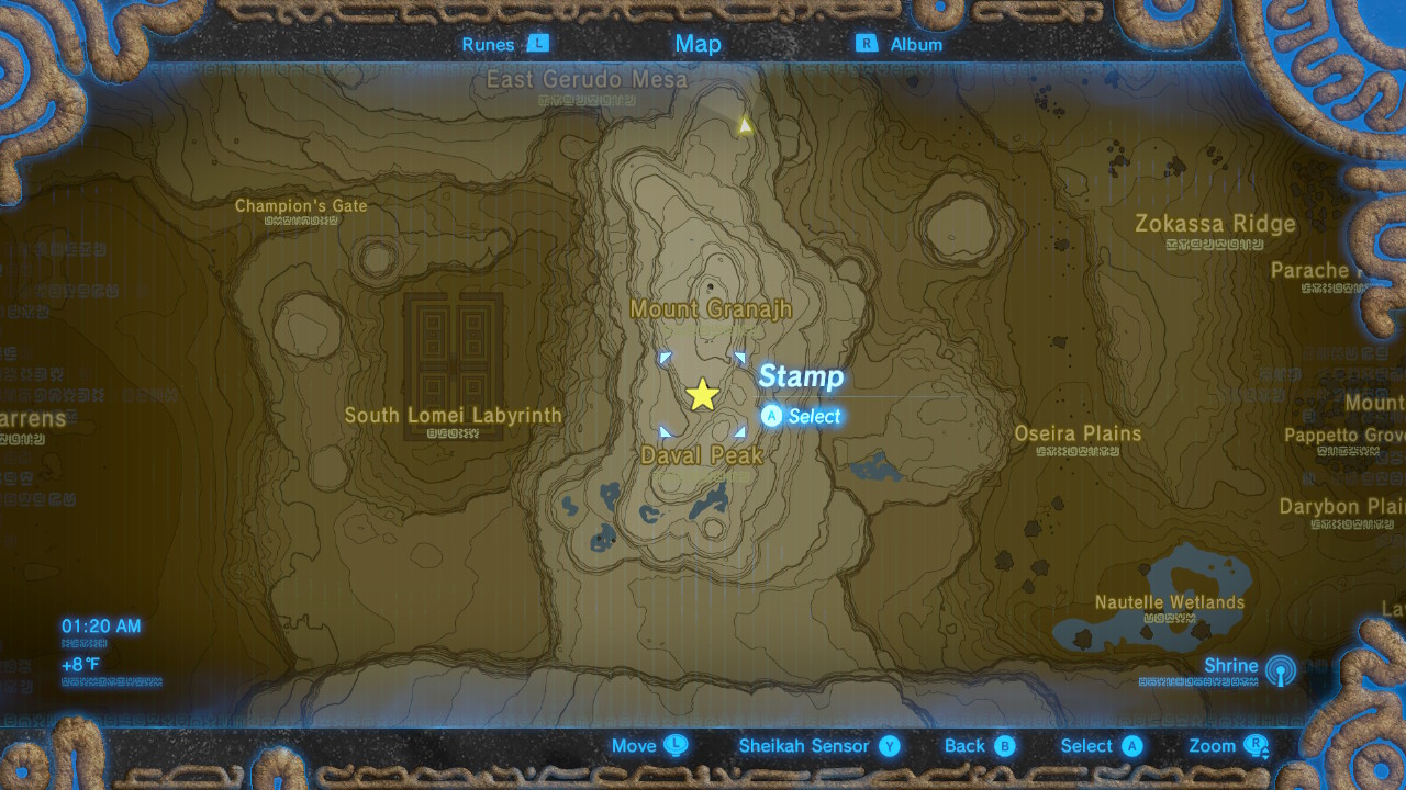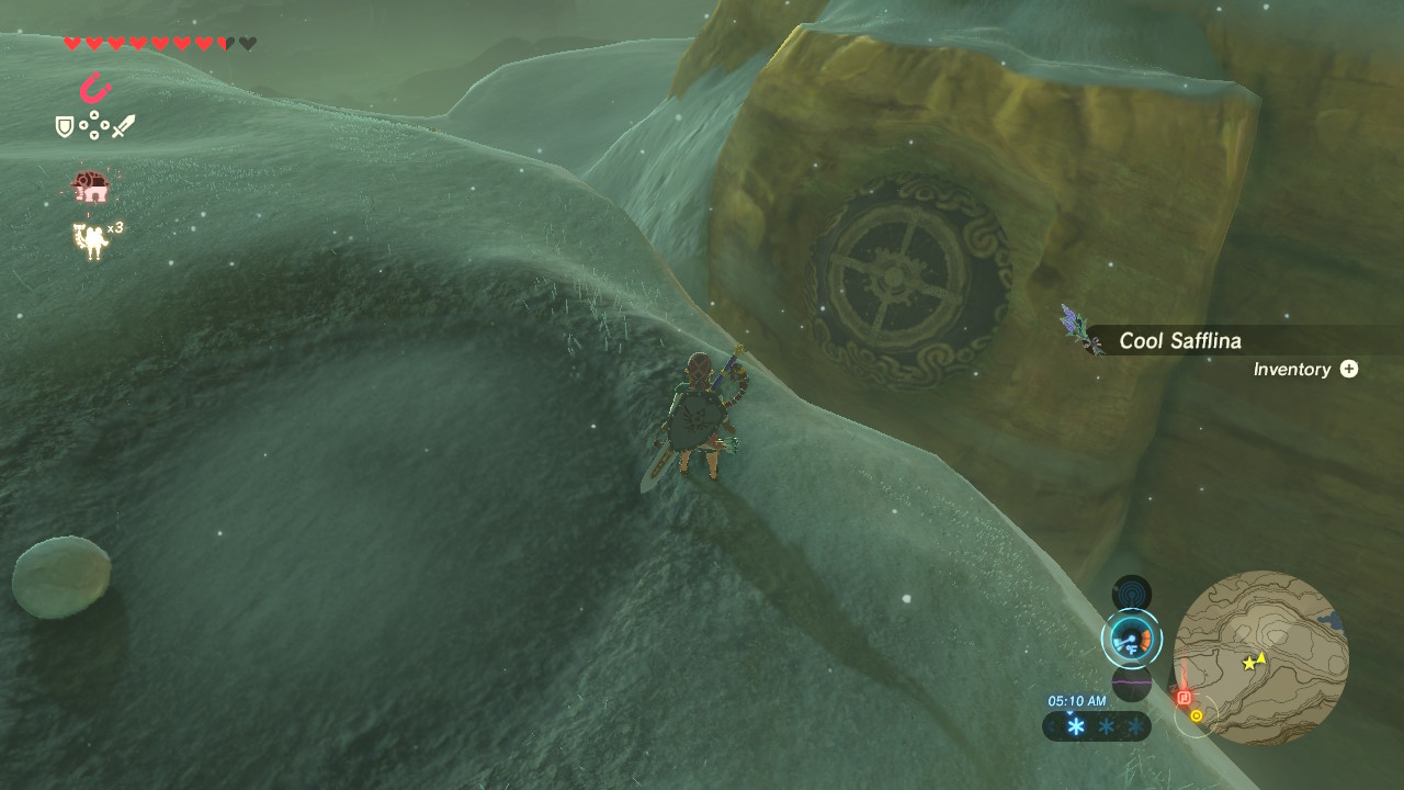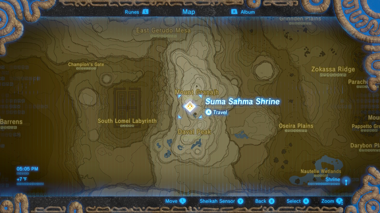 This tricky shrine requires a quest to reveal. Travel to the top of snowy Mount Granahj to find an abandoned log cabin. The climate is cold, so bring some warm clothes and spicy food before trekking down to this location. Check your map to spot the small structure south of the peak.