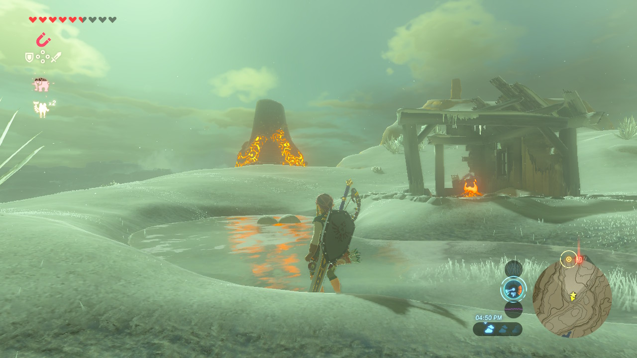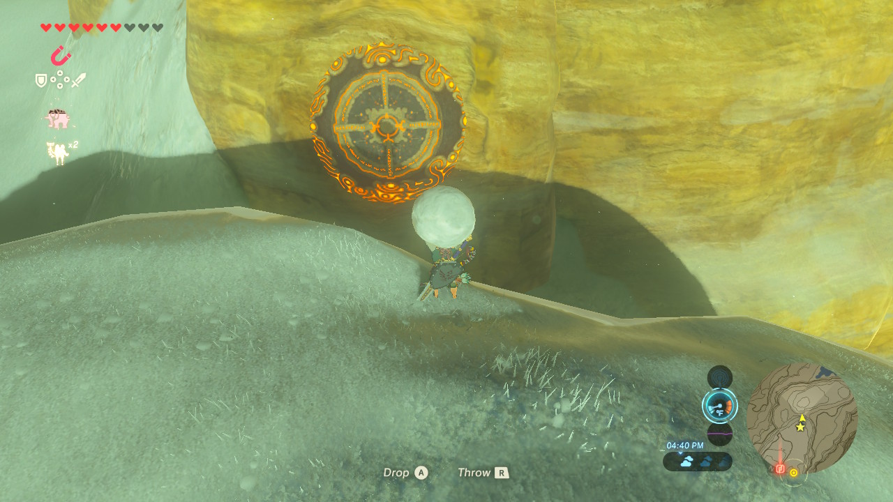 Light a fire in the destroyed shack to warm yourself and allow you to rest. Wait until about 4:20 PM and grab one of the stones near the shack. Hold it over Link’s head, then position yourself so the shadow of the stone fits into the small circle in the center of the glowing ancient panel.