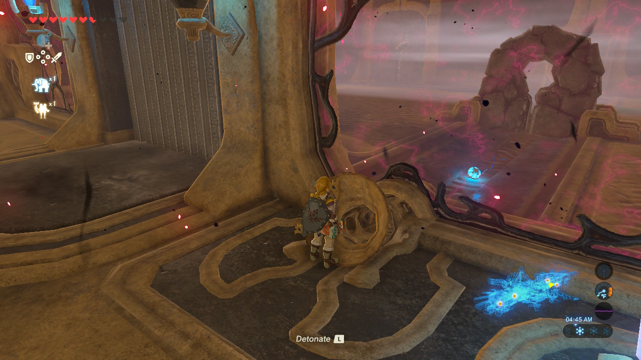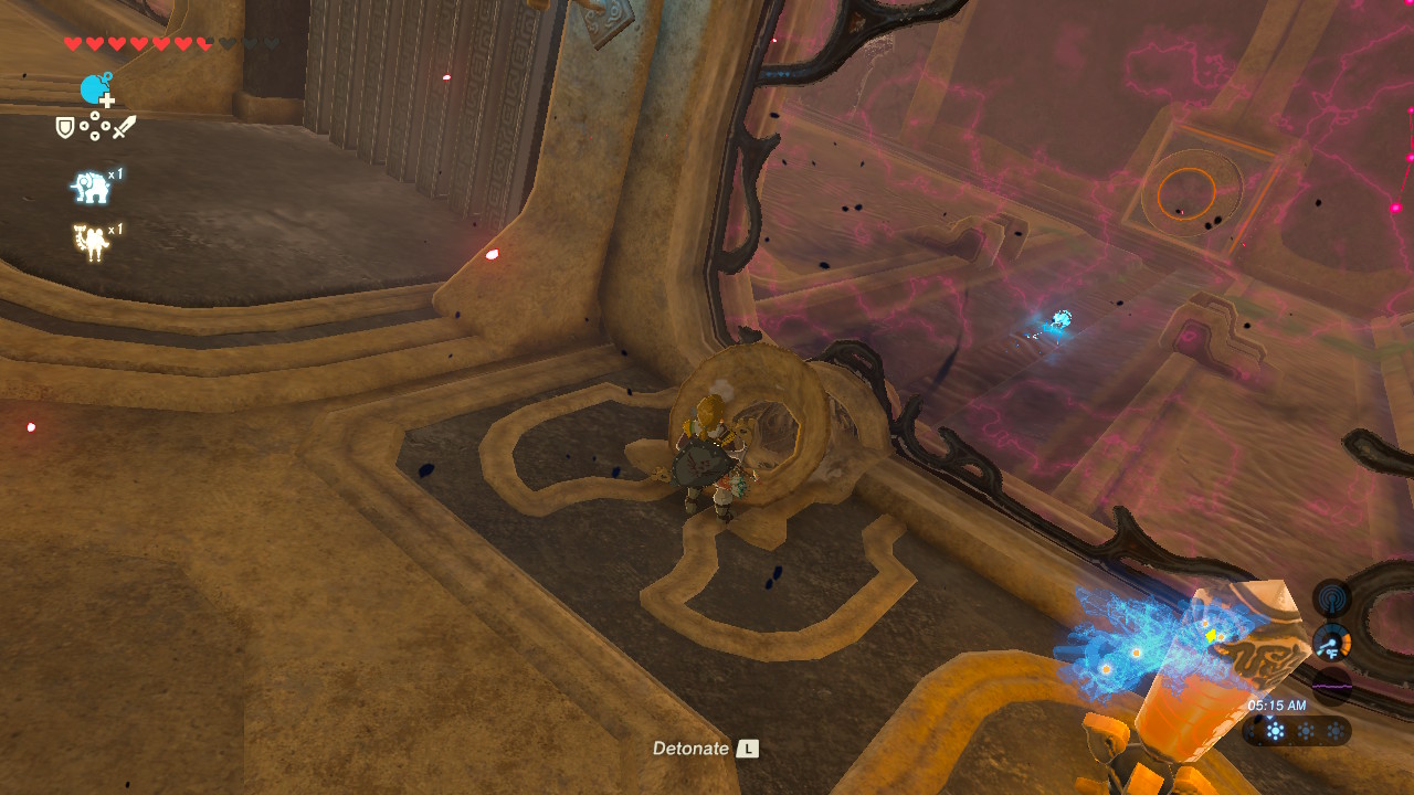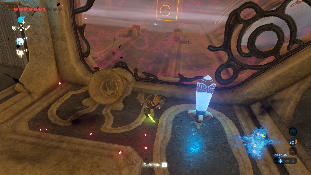 For the second Sheikah terminal, move Vah Medoh to the “up” position. Next to the vent switch, there’s a strange tube. Drop a round bomb into the tube. At the “up” position the bomb will roll into the cracked wall. Detonate, then roll a second bomb down the funnel. Activate the switch so a draft blows the bomb left, then detonate again to destroy a wall and reveal a larger rolling ball.
