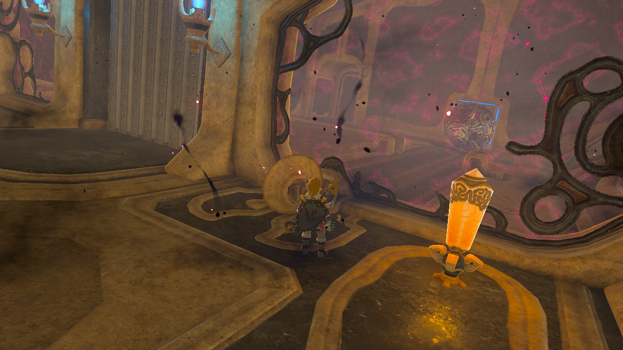 The first Sheikah terminal is relatively simple — enter the left wing from the passage near the third optional chest. In this room, shoot the corruption eye to clear the goop around the first terminal, then hit the orange switch in the back-right corner, to the right of the gate.