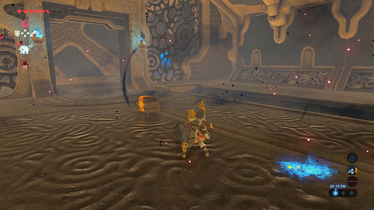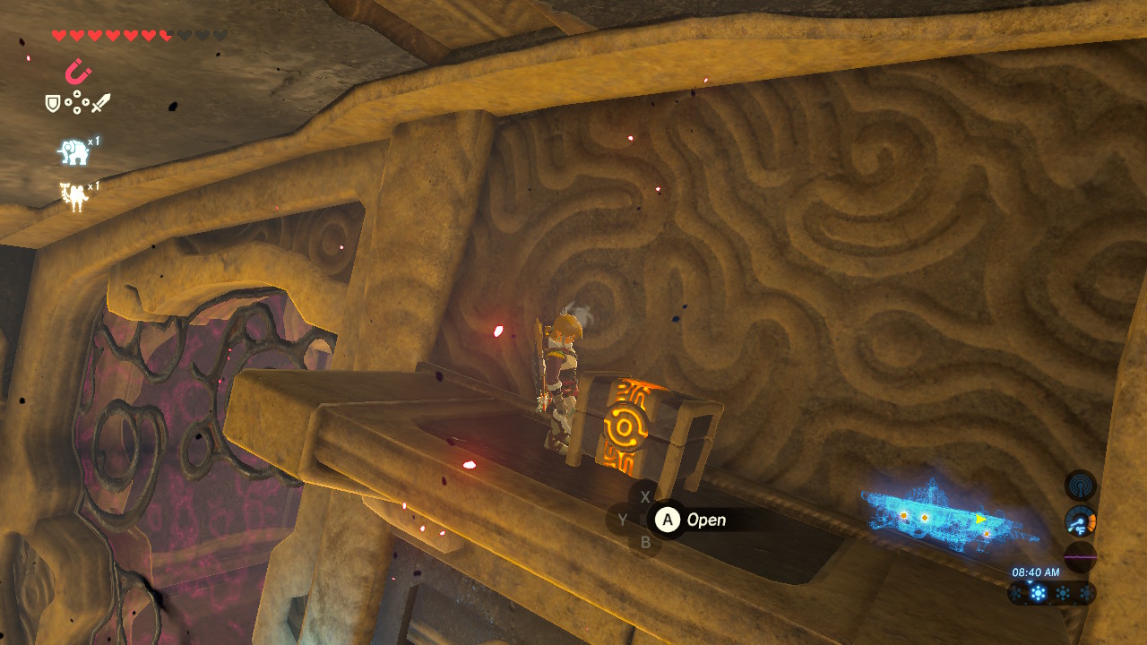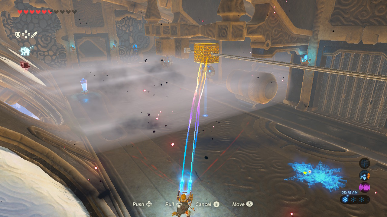 - Optional Chest: The third chest is up the ladder to the left of the updraft in the same room. Move the metal platform with Magnesis to trap the platform on tracks so it gets stuck when adjusting the tilt of Vah Medoh to access the ladder.