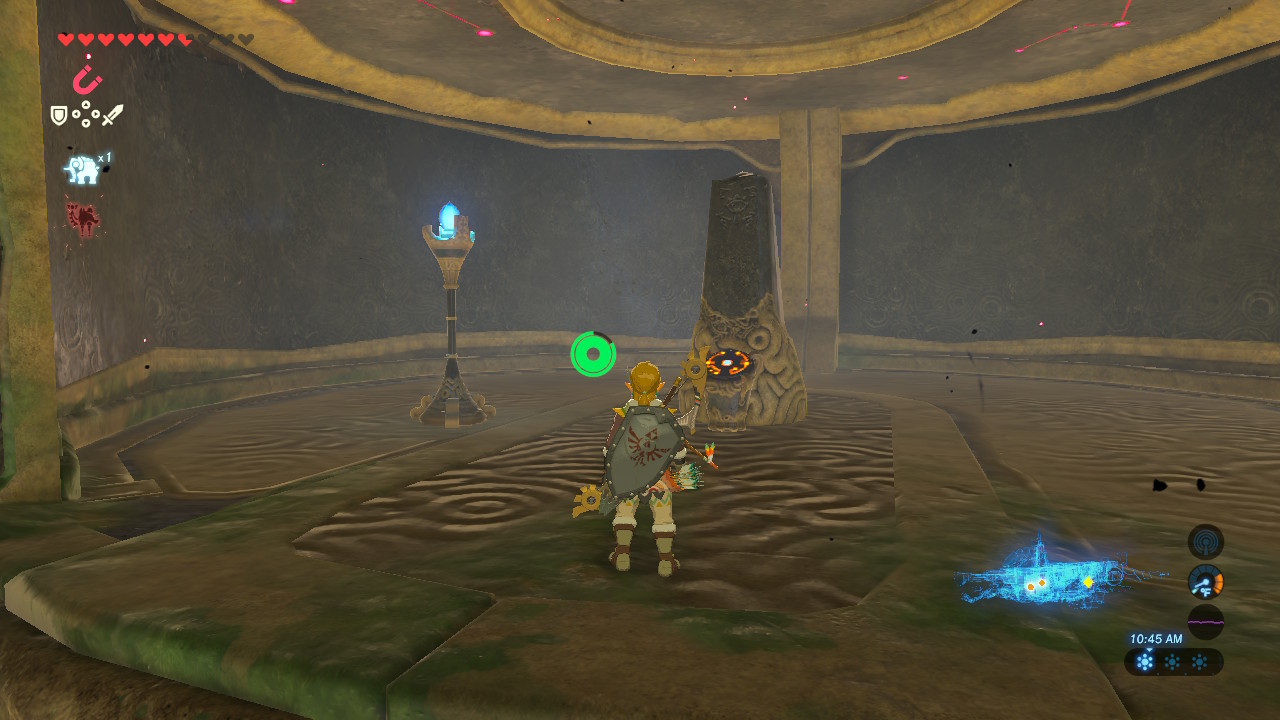 Step #1: The Guidance Stone map terminal is found in the large room ahead. Kill the corruption by shooting the eye on the right, then cross the area with the large blocks on tracks. Use Magnesis to readjust the metal platforms, allowing you to reach the opposite side. Defeat the Guardian Scout and use the terminal to get the map — and the five Sheikah terminal locations.