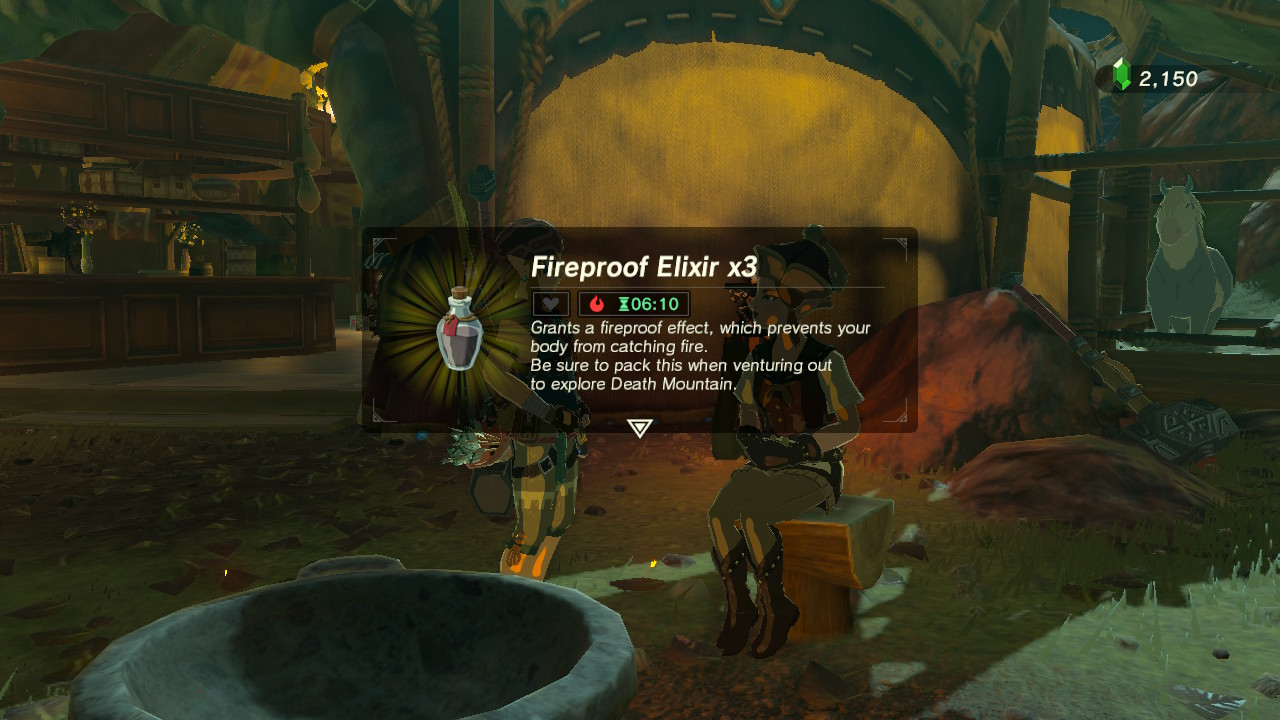 - Talk to Gaile near the cooking pot. She’ll sell Link up to three Fire-Guard Elixirs for 150 rupees.