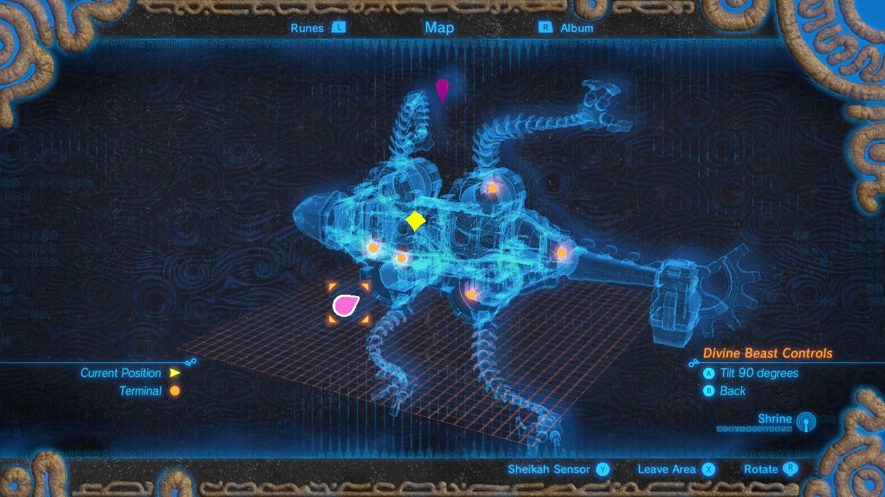 After using the map terminal, the shutters in the torso area will open, bringing light to the previously pitch-black room. Now that you have the map, Link can begin using the five Sheikah terminals. Once all five are activated, the main control unit will unlock, allowing you to battle the aspect of Ganon that controls the Divine Beast.