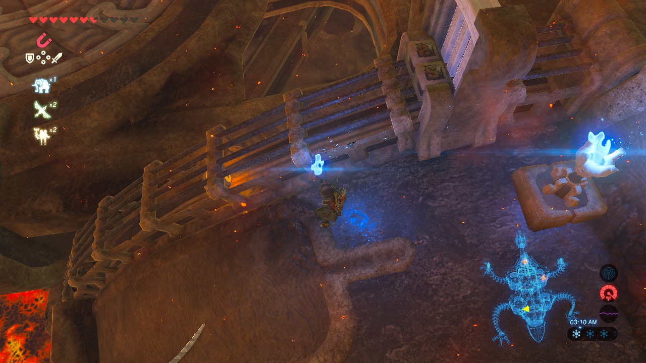 Unlike other “battles” — this is all about stealth. Vah Rudania sends a swarm of flying sentries. To get Yunobo to Vah Rudania, use your whistle [Press Down on the Left Joycon] to call your Goron pal when the coast is clear.