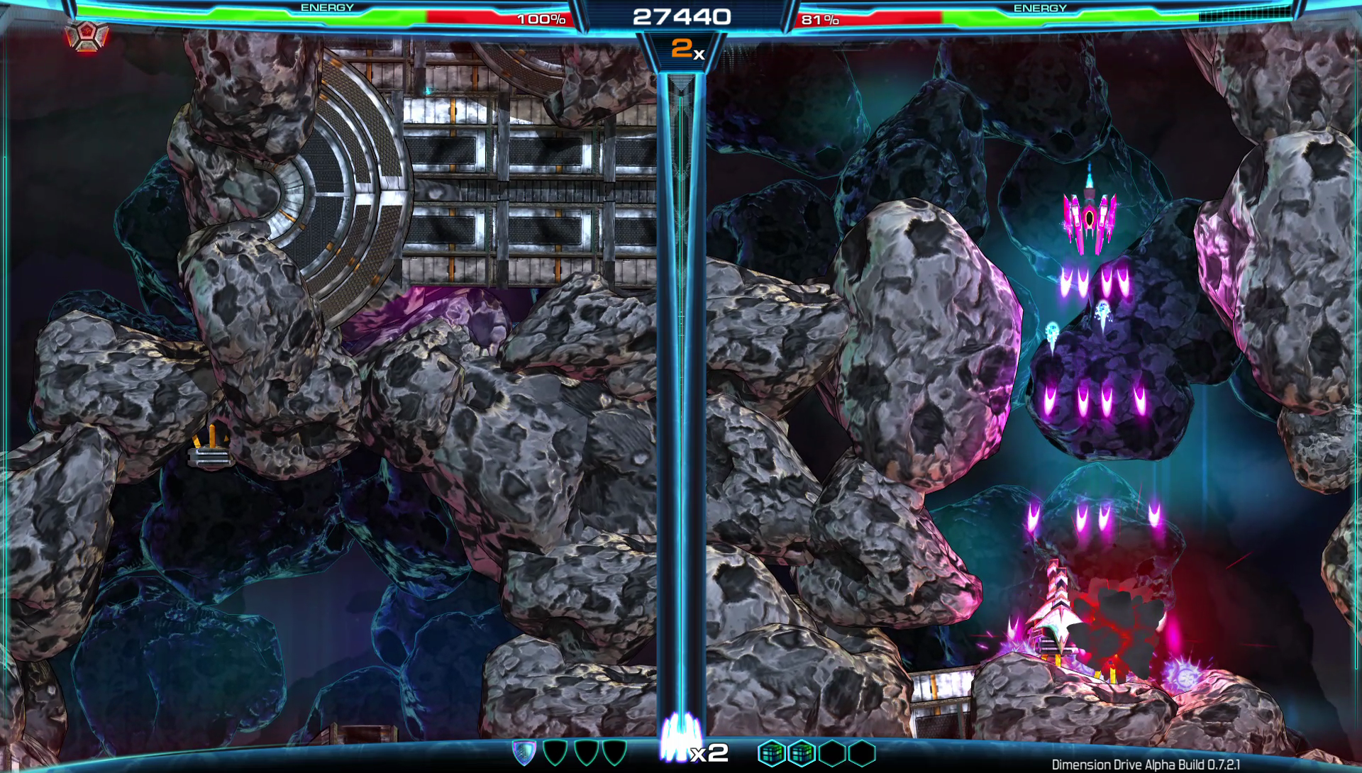 The road to release hasn’t been a simple cruise through space, either. Drama ensued when Dimension Drive‘s kickstarter was trolled by a false pledge, but 2Awesome Studio didn’t give up, and returned to the crowdfunding website to make Dimension Drive a reality. Unlike the standard shoot ’em up, it shakes up core gameplay by splitting the screen in two and tasking players with teleporting between different sides. Naturally, local co-op is an option, but Dimension Drive is unique because it offers the same experience in singleplayer, too.