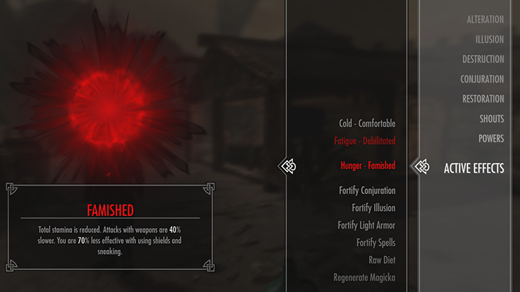 - Hunger – Impacts overall stamina, ability to wield most weapons. Can be restored by eating food.