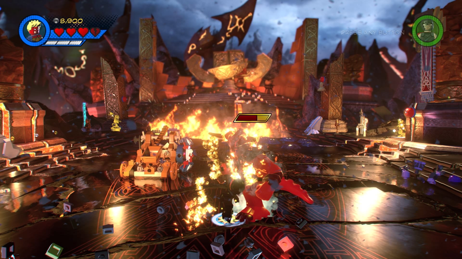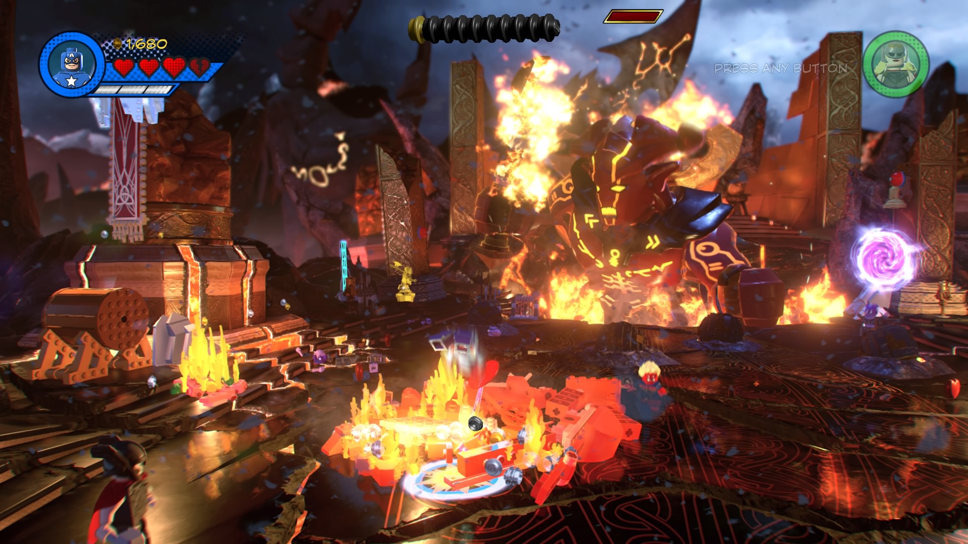 To beat Surtur, fight his endless swarm of minions and look on the right side. Melt the gold statue with Captain Marvel’s laser, then build the bricks to create a water barrel deposit. Grab it with any power character and throw the barrel at Surtur when you’re close – about two more hits should do it.