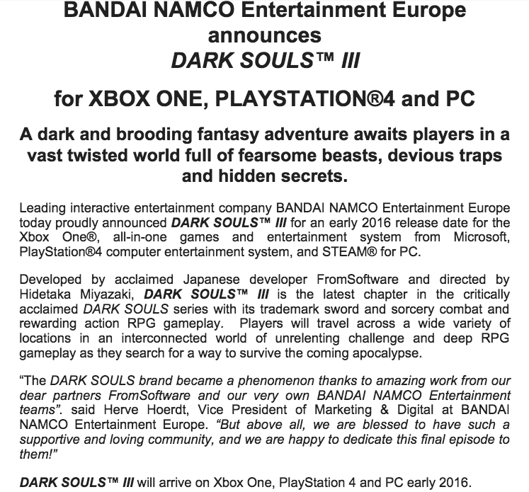 A trailer for Dark Souls 3 was shown during Microsoft’s E3 2015 press conference, announcing a release date of “early 2016,” today.