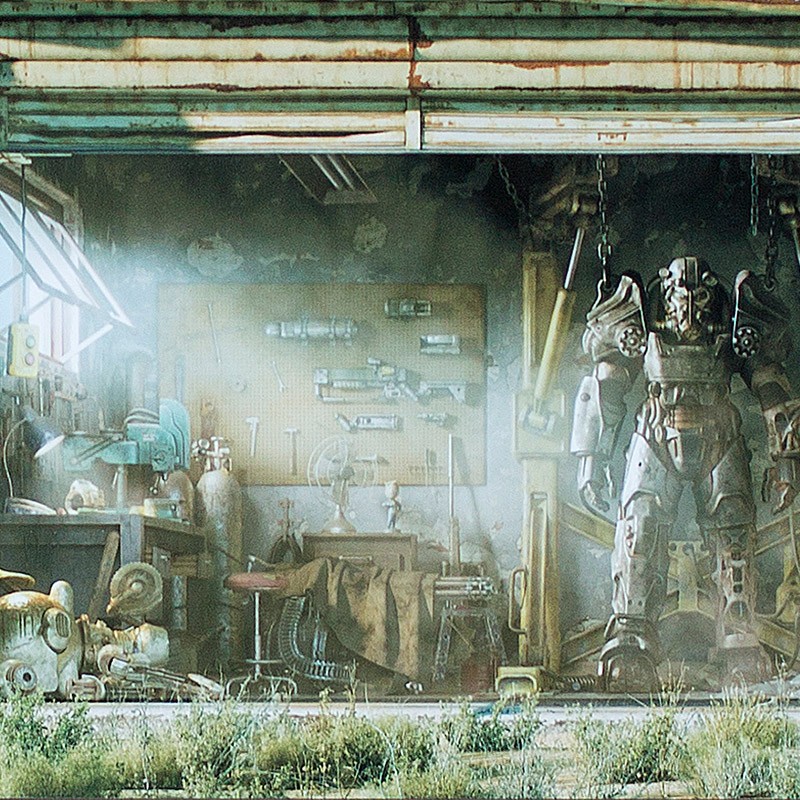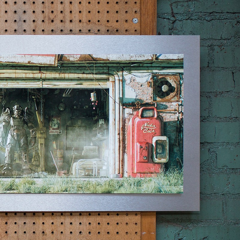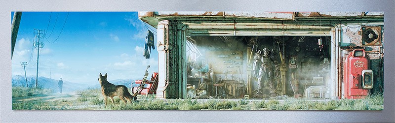 The release of Fallout 4 is now three months behind us, but the merchandise parade rolls on. Today Bethesda has announced a limited edition garage metal print, only 250 of which will be made. Sized 19″ x 60″ with a double layer of metal sheeting to achieve a 3D effect, the print features the image from the loading menu of Fallout 4, the Red Rocket station garage with a suit of Power Armor, with the addition of Dogmeat and the Sole Survivor from Vault 101. It is expected to ship on March 29, 2016 and each will include a numbered Certificate of Authenticity.