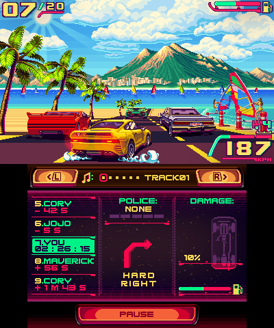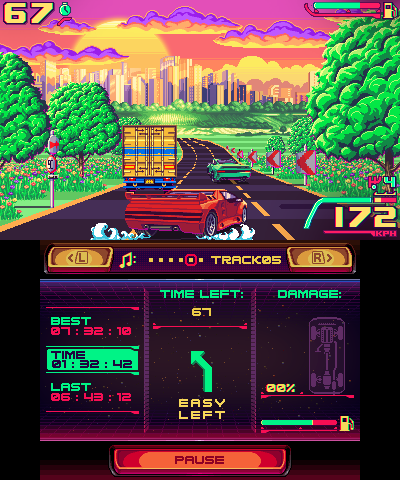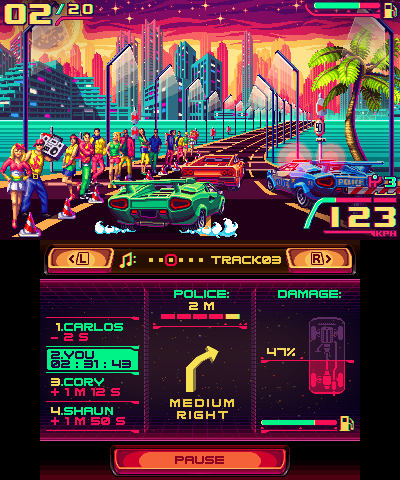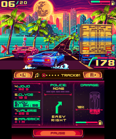 80’s Overdrive is a game similar to Out Run and Rad Racer. It’s third-person perspective 2D racing game with 16-bit graphics. Published by Insane Code, it will come to the Nintendo 3DS eShop in Autumn 2016.