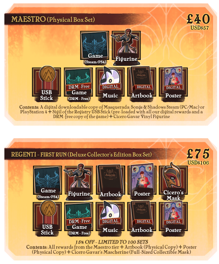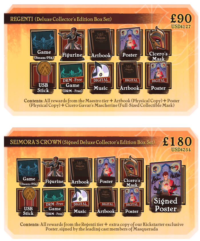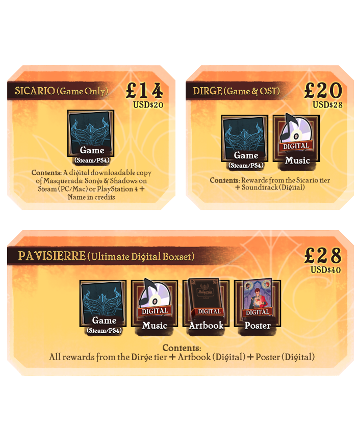 The reward tiers stay in a modest budget from the smaller to largest possible options. For £14 ($20 USD) you get a digital download of Masquerada: Songs and Shadows for Steam or PS4, plus your name in the credits. But for the most generous backers out there, the £180 ($259 USD) tier you get a signed Kickstarter exclusive Poster, a DRM Free copy of the game, a figurine, a physical and digital artbook, a USB stick, a copy of the game soundtrack, and a life-sized mask that’s the same as what the Cicero character wears in the game’s intro sequence.