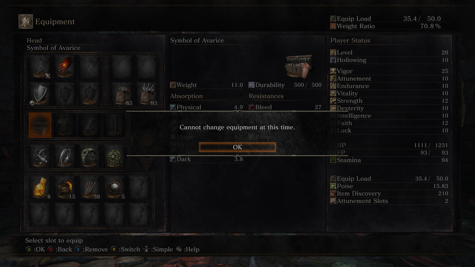 This just happened to me. Couldn’t figure out wtf was going on. Could still be something else but I don’t see what. One second I get a message I’m being invaded, and a split second later, I’m loading Fire Shrine, I have 80,000 extra souls, my character’s body looks like a lizard, I can’t change equipment, and I’m hollowed but can’t use a Purging stone. Not being able to swap gear while wearing a Symbol of Avarice is extremely inconvenient.