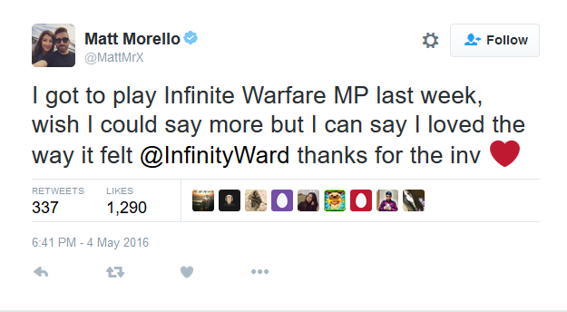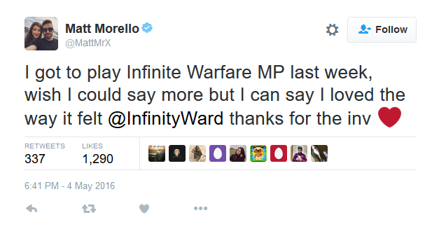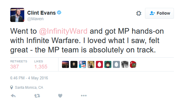 Thanks to PlayStation Lifestyle, these suspicious tweets came to light. There were a number of different eSports players who attended an event at Infinity Ward’s studio last week. Each was given a chance to play the multiplayer mode for the upcoming Call of Duty: Infinite Warfare video game and the tweets that went out to their followers seemed a bit too similar.