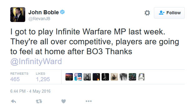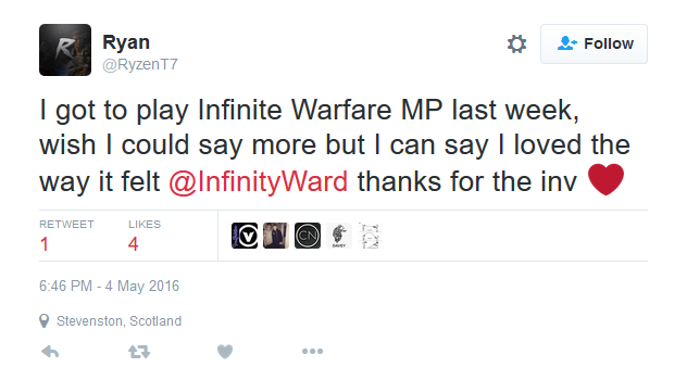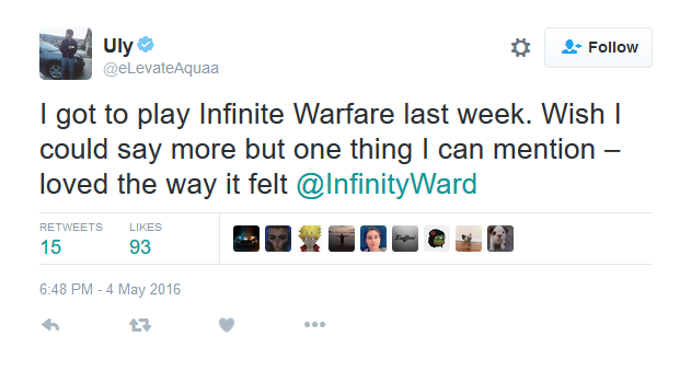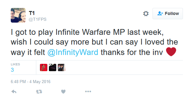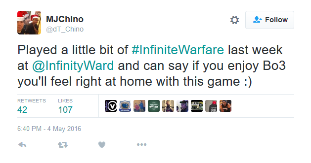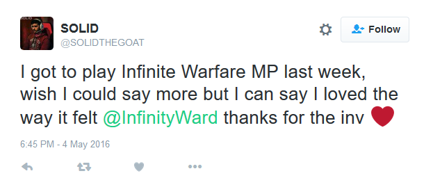 Call of Duty: Infinite Warfare was officially unveiled just last month and the response has been for the most part mixed. There has been some fan hate towards the Call of Duty: Infinite Warfare trailer and more recently, a few eSports players were given a chance to play the game early. Looking at some of eSports player tweets, they are way too similar to be their own unbiased opinion, but anything’s possible, check out the tweets down below.