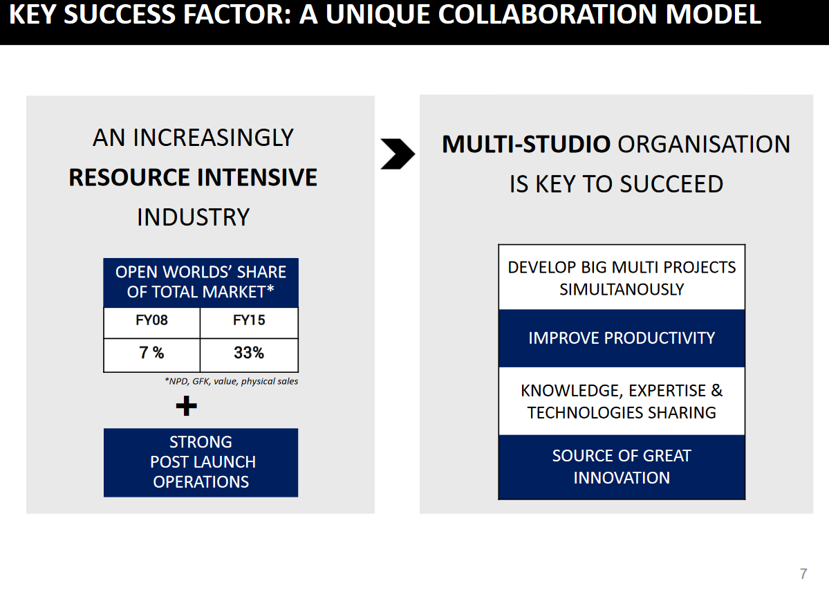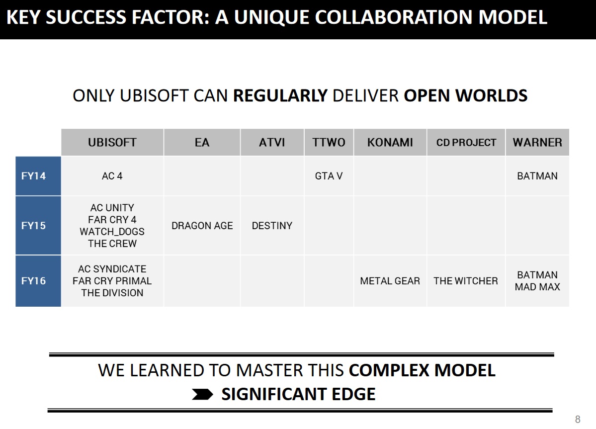 One of the early things the slideshow talks about is Ubisoft’s focus on open world games. Within the past 8 years, the total market share of open world games has grown at a steady rate. Ubisoft thinks this trend will continue, and they can capitalize on it by developing big projects simultaneously, along with a focus on strong post launch operations.