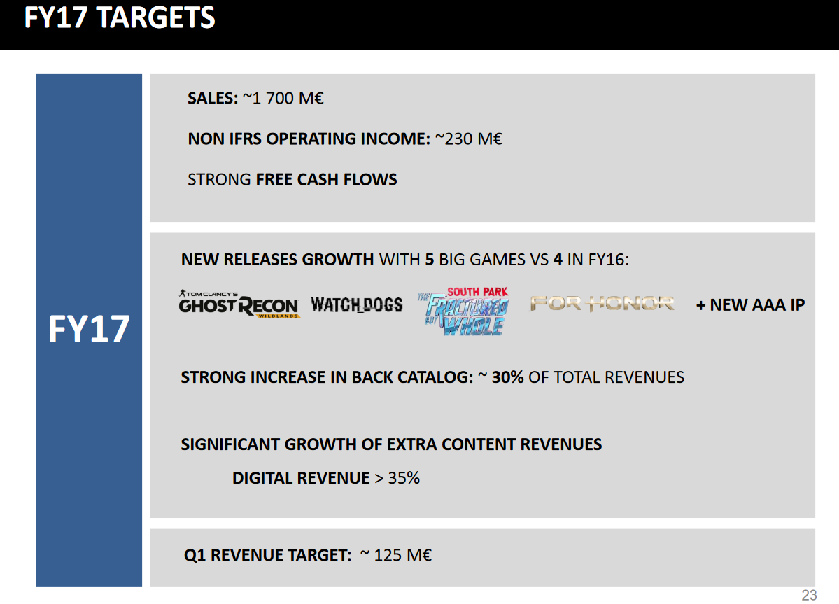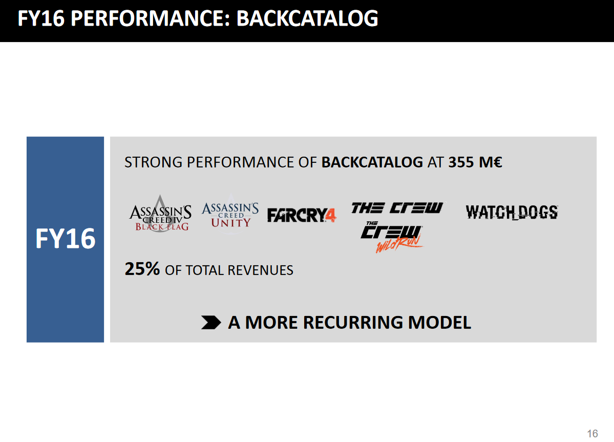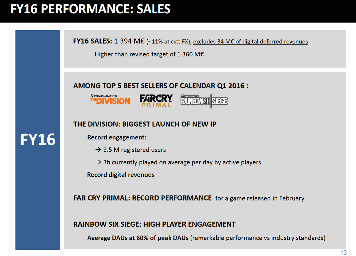 “Top 4” video game company Ubisoft released their FY16 Earnings presentation today. You can check it out here if you want the cold hard numbers to crunch, but here’s a general summary of the highlights withing the slideshow presentation.