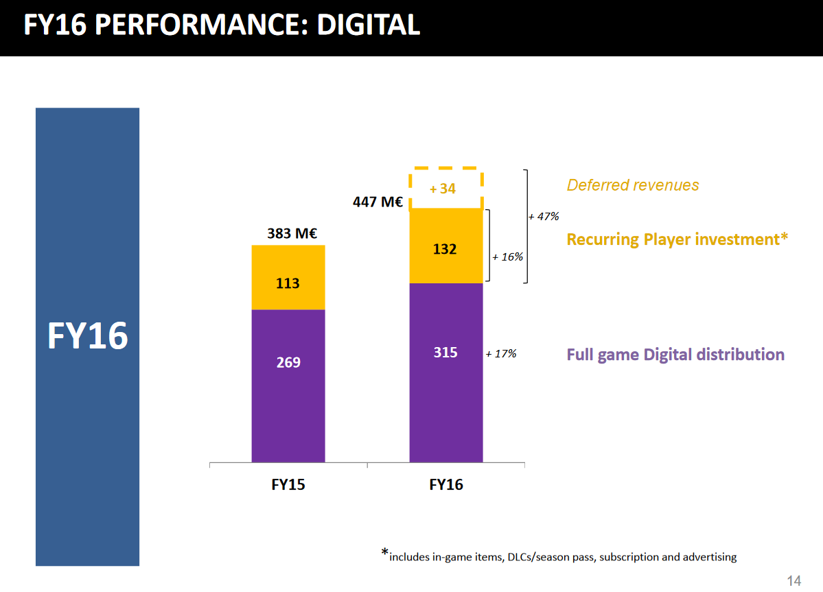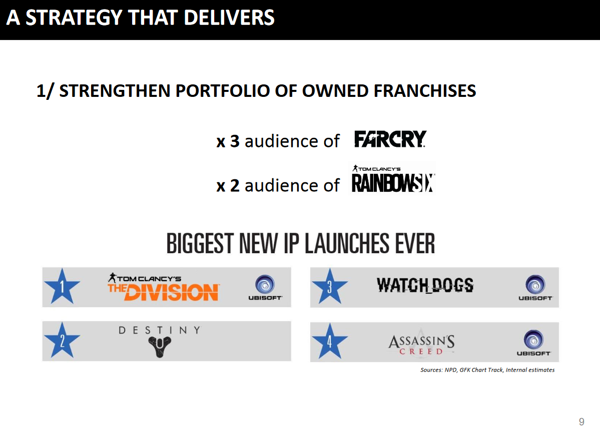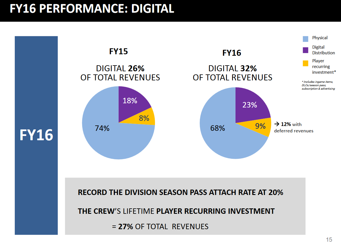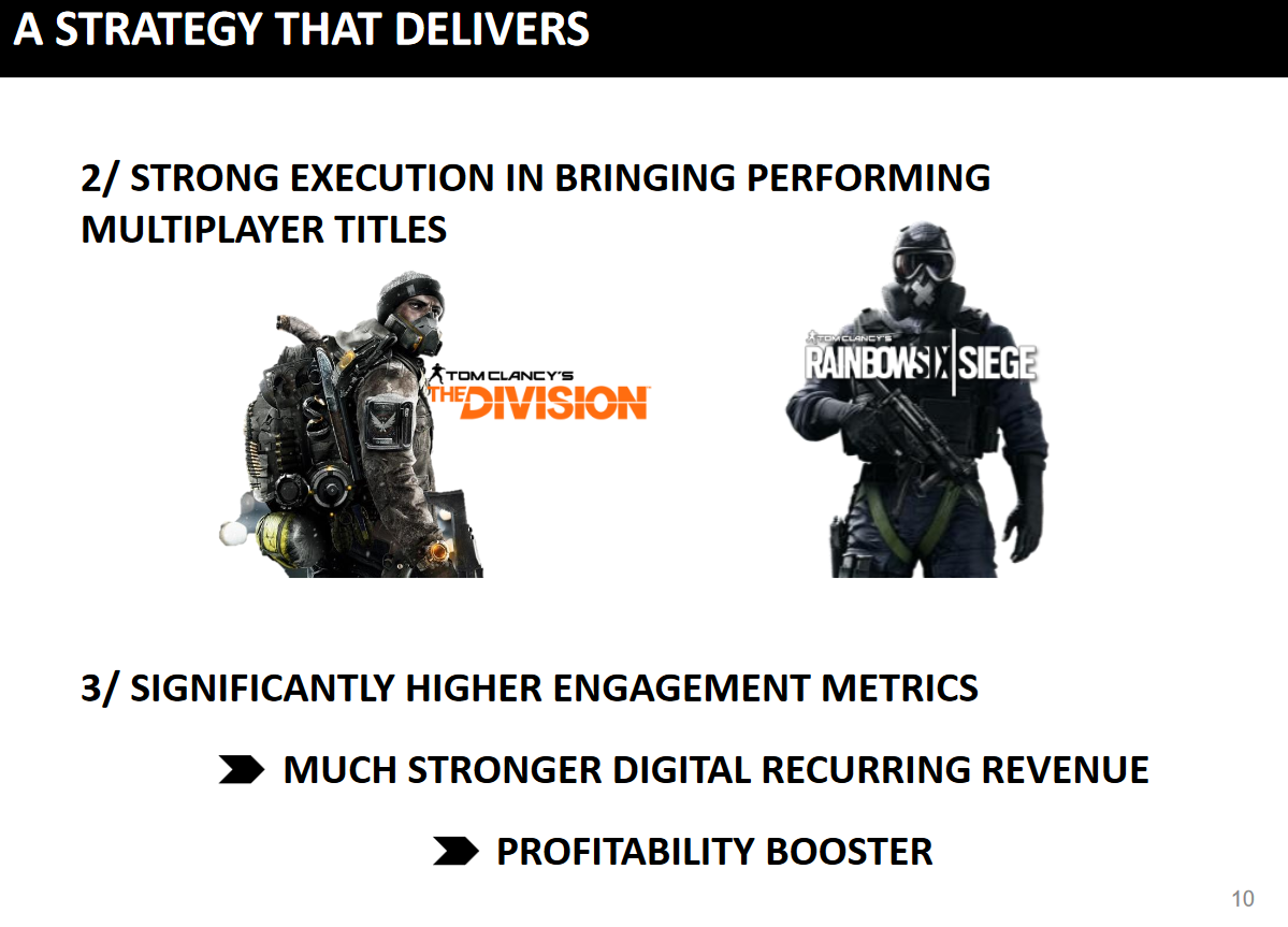 Ubisoft makes the point that The Division, Watch Dogs, and Assassins Creed hold 3 out of 4 of the top spots for “Biggest New IP Launches Ever”. Going on to state that The Division and Rainbow Six Siege had strong execution for multiplayer offerings, resulting in a strong recurring digital revenue stream.