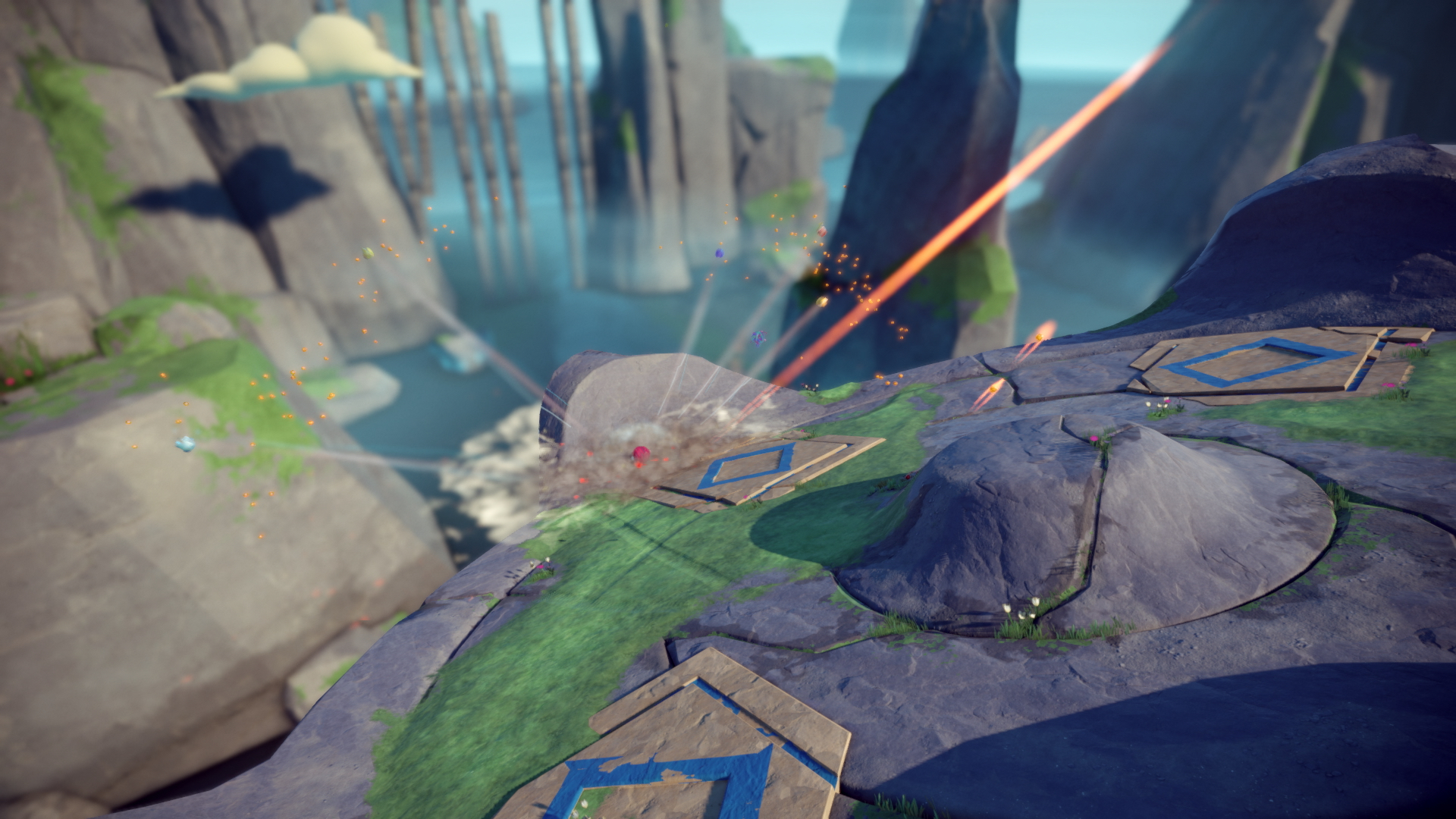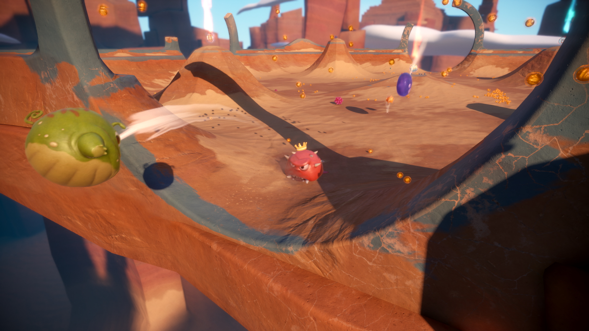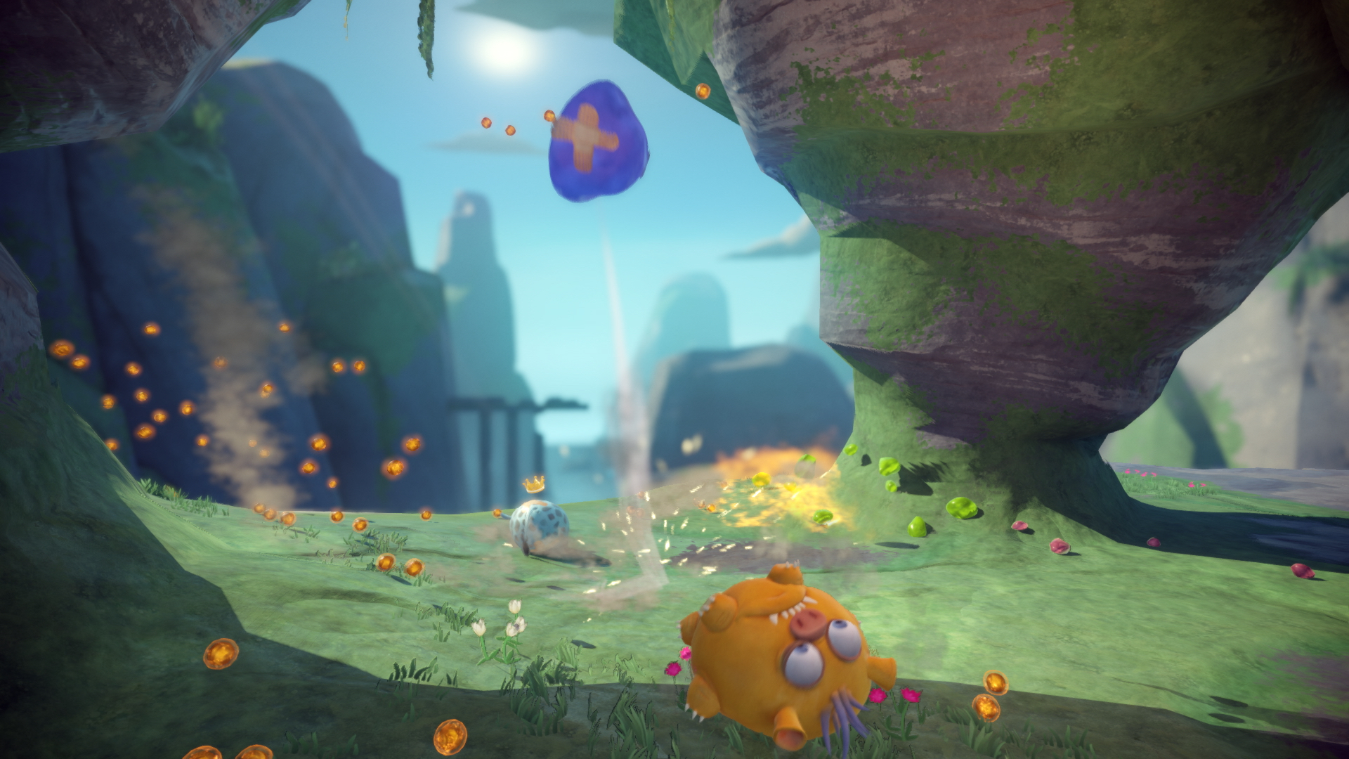 It’s a competitive mutliplayer game where your blob of goo rolls and jumps around a map trying to eliminate their opponents. You can either shoot them with goo, throw them off the arena’s edge, or just smash into them head-on. The spoils of war from slaying your enemies are tiny goo blobs (tribs) that increase your size and refill your ammo. There are also power-ups that appear, giving your goo special abilities that unleash special destructive moves or give your goo other short-timed edges against everyone else.