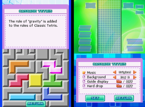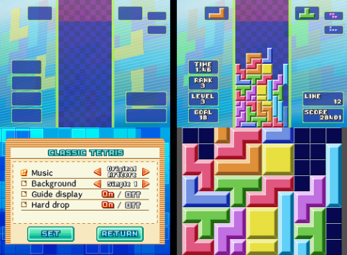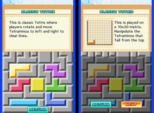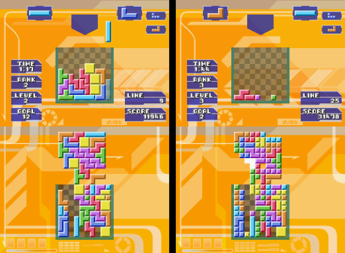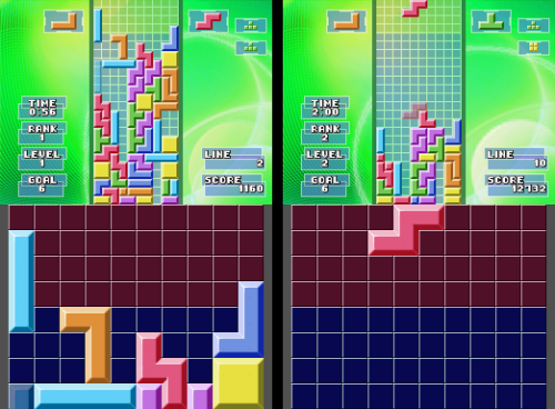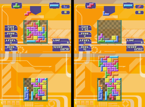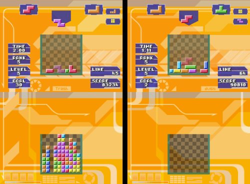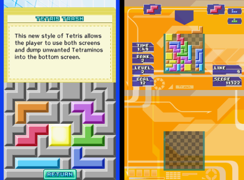 Xkeeper walked through all the game modes in their post. Classic Tetris was the mode that the defined the original Tetris game in the first place. Hotline Tetris was a variation on the Tetris Worlds concept. Goal points are only scored when clearing marked lines. Tetris Draw had you draw game pieces on the screen and drop them in, having you race against randomly generated pieces that rose from the bottom on their own. Tetris Warning took place in a 48 blocks tall playing field, with random Tetraminos falling at preset time. Tetris Trash had two play areas – one with a standard 10 by 10 square in which playing outside of would result in a game over. But pushing Y would reveal a second playing field where it’s only limited by gravity. Clearing lines on either of these fields would break apart Tetraminos on the bottom field, which could potentially cause a chain reaction of scores.