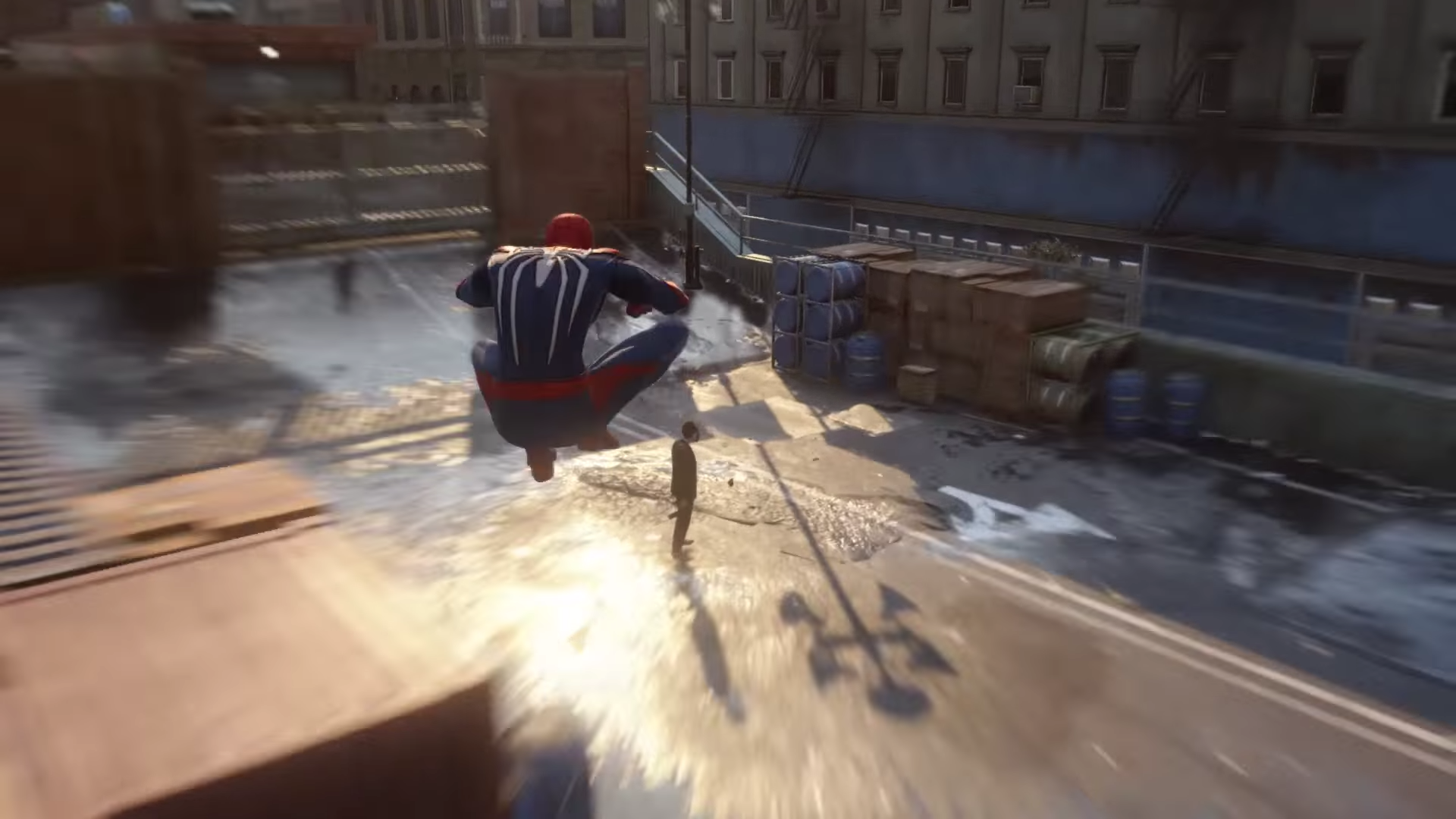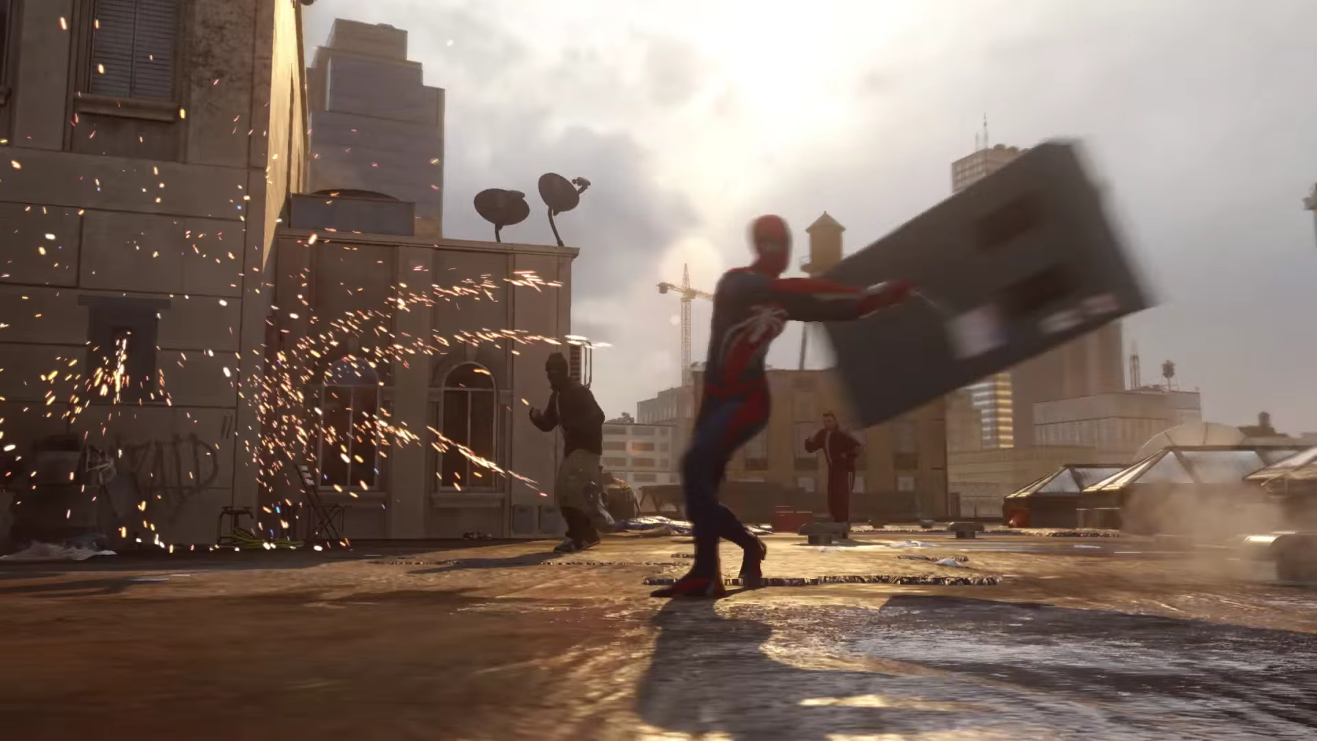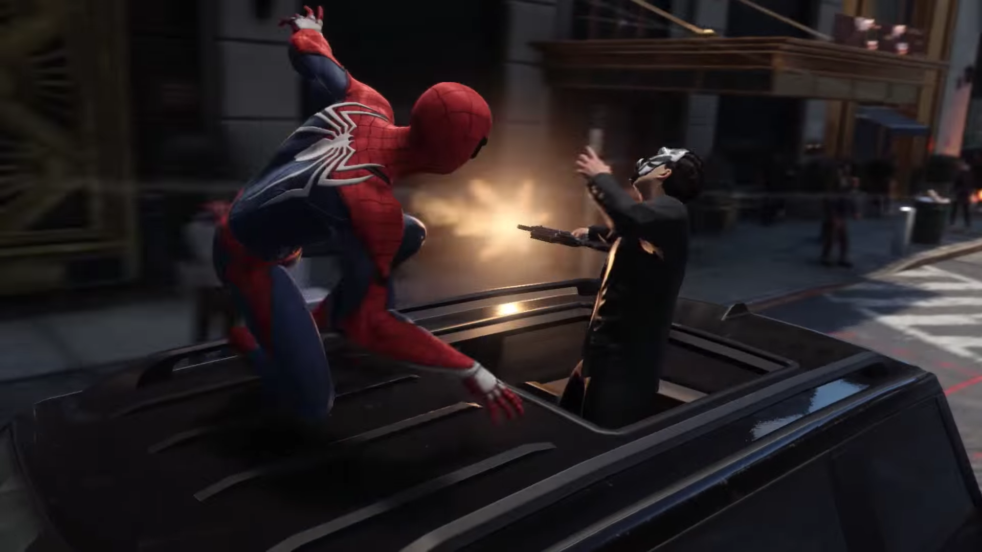 The suit used by Spider-man appears to be of a similar era and style as the suit used in the Captain America: Civil War movie. We’re taken on a tour of Manhattan, via the same and comfortable third-person camera used in many of the previous Spider-Man video game titles. But in this new generation of games, we appear to have flexibility with navigating between the outside environment and the interiors of buildings. Spider-Man is also seen tying a thug in web while in a moving car, snatching the brute out of the vehicle while it’s in motion.