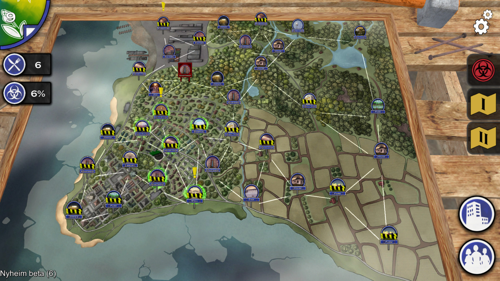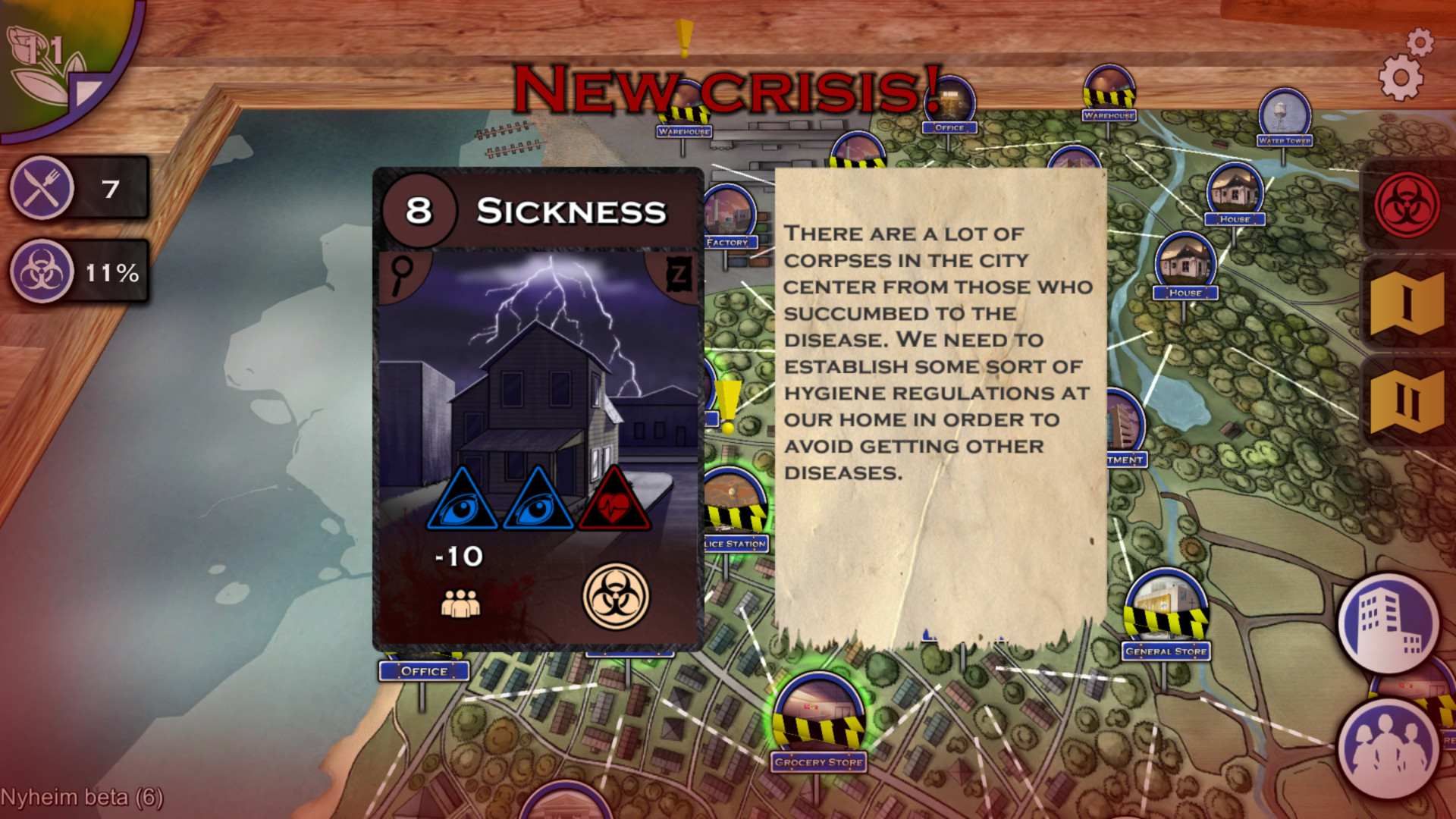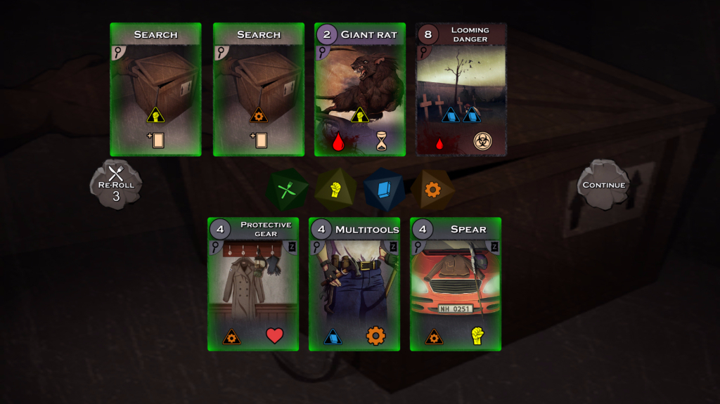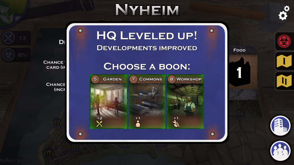 Nyheim is a single player dice-rolling video game, where your outcome is bound to four core attributes. Your Awareness, Endurance, Speed, and Wits are involved in every aspect of your actions and experiences, such as combat and skill progression. The survivor search party moves around Nyheim from place to place in order to scavenge for supplies, rest and heal up, or complete some other objective. You’ll balance that roaming party with your HQ, which becomes the foundation for your New World society. As time goes on, the rats will die out slowly. But it also means finding supplies out in the world is much harder.