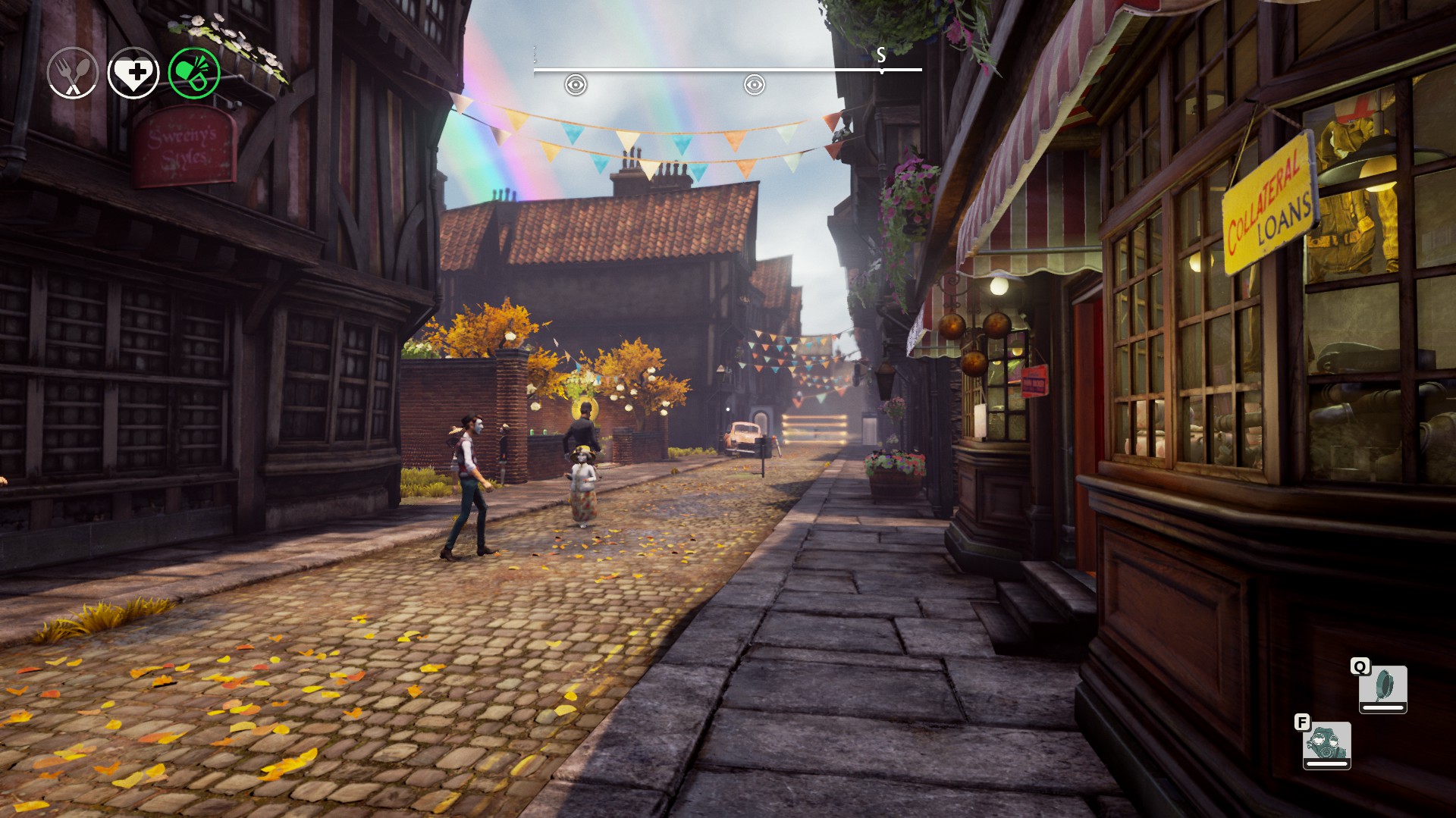 You start out in the Garden District, after being cast out of your previous life after becoming a “Downer” (someone who doesn’t take their joy). The game gives you a safehouse where you can sleep and stash any extra items you come across in a personal safe. When you climb out the safehouse hatch for the first time and step out into the district proper, what you see is a somewhat random design. In We Happy Few, the world is procedurally generated. Every new playthrough, the arrangement of the city is going to vary. What does stay the same however, are the game’s quests and the interior setup inside the houses and buildings. It’s where these key features of the area are placed, is what’s random.