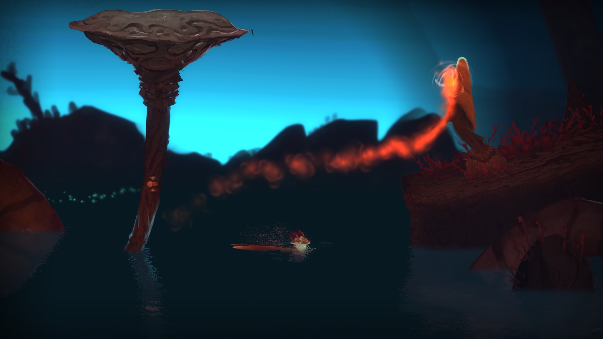 The game introduces the mechanics as you explore the environment itself. It’s more of a platformer game than meets the eye at first. The screen gives a visual/audible prompt when something of interest is nearby, and using the e button activates the fox’s yip that causes parts of the area to change. They’re nature items: exploding mushrooms, vines that extend out like a bridge to let you pass over gaps, and vats that have wind shooting out of them (to name a few examples). As you gather the fragments of the seasons, these objects and instances gain an additional layer of complexity to them. Every season has it’s own weather climate and ability to change the environment, and that’s the core of what Seasons after Fall is about. Take the game’s water geysers for example. In winter, these plumes of water freeze and form a platform you can stand on. But in the Fall season, they only shoot a little water, while in the Spring season the water levels are much higher because of the rainy weather. It’s these puzzle-solving opportunities that let the game’s difficulty level ramp up at a consistent pace as you progress.