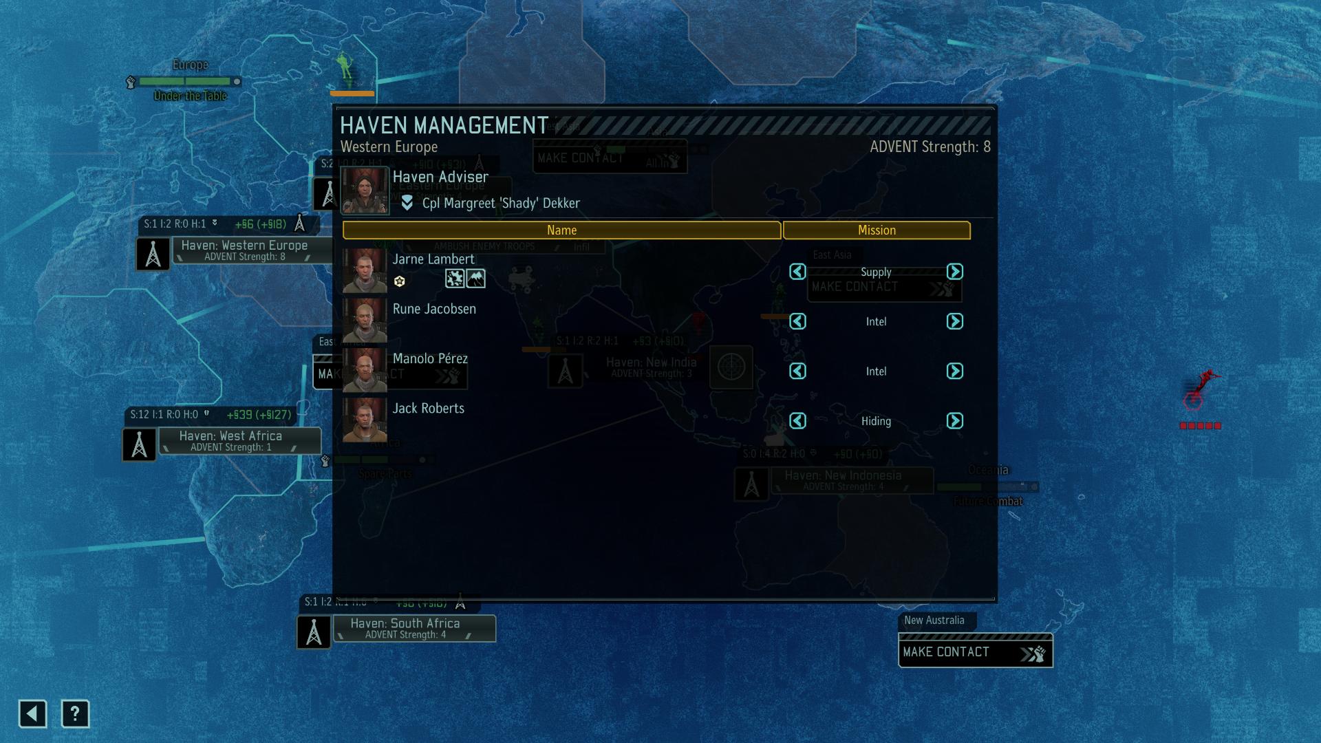 Players must now manage the Resistance within each region they have contacted. Each region has a certain number of rebels who may be assigned to one of three different tasks: searching for supplies, recruiting new rebels and soldiers, or gathering intelligence to generate new missions.