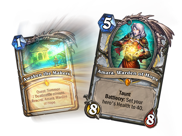 One example is Awaken the Makers: this gives the player the task of summoning seven Deathrattle cards. Once you do so, you will obtain Amara, Warden of Hope, a five-mana 8/8 card with Taunt that has a Battlecry that sets your hero’s health to 40.
