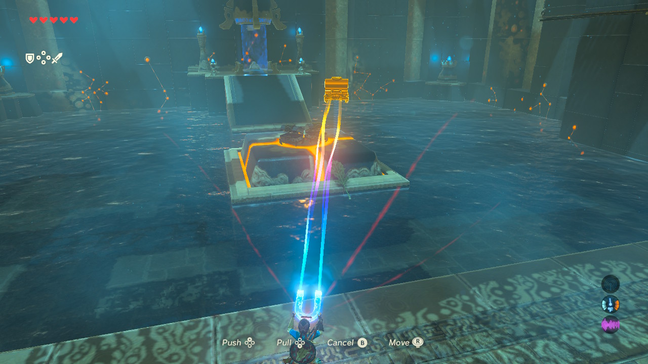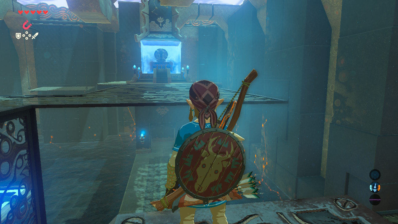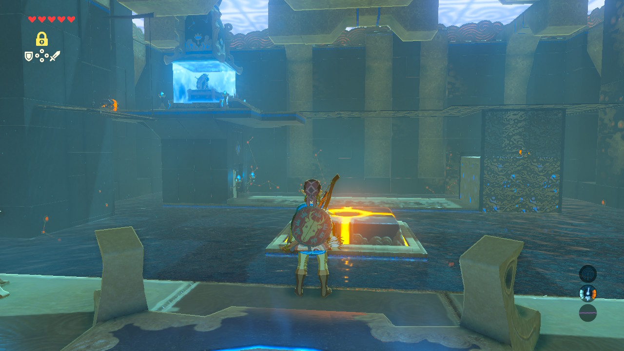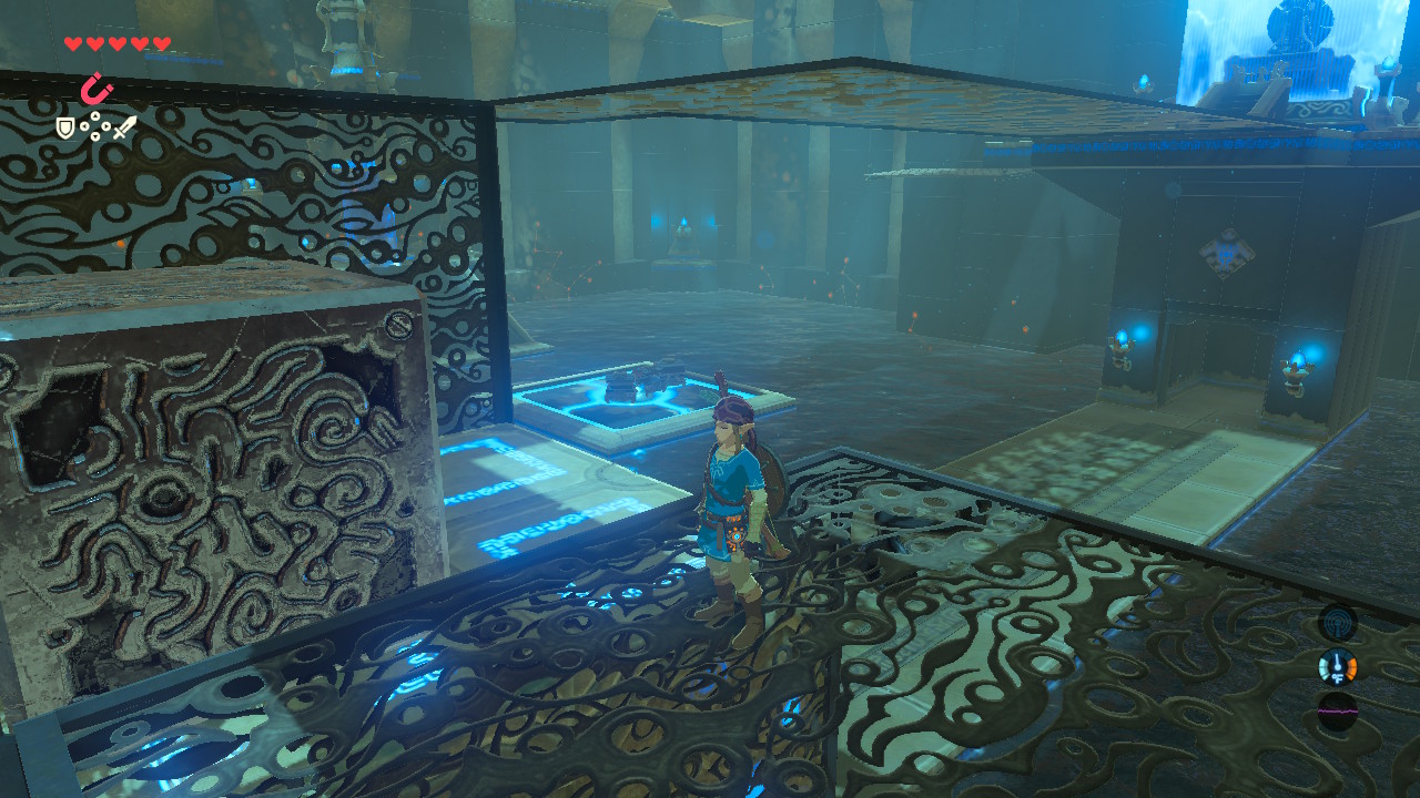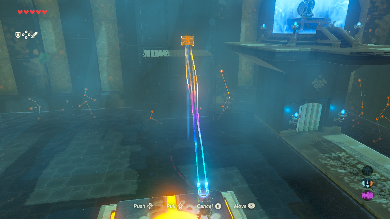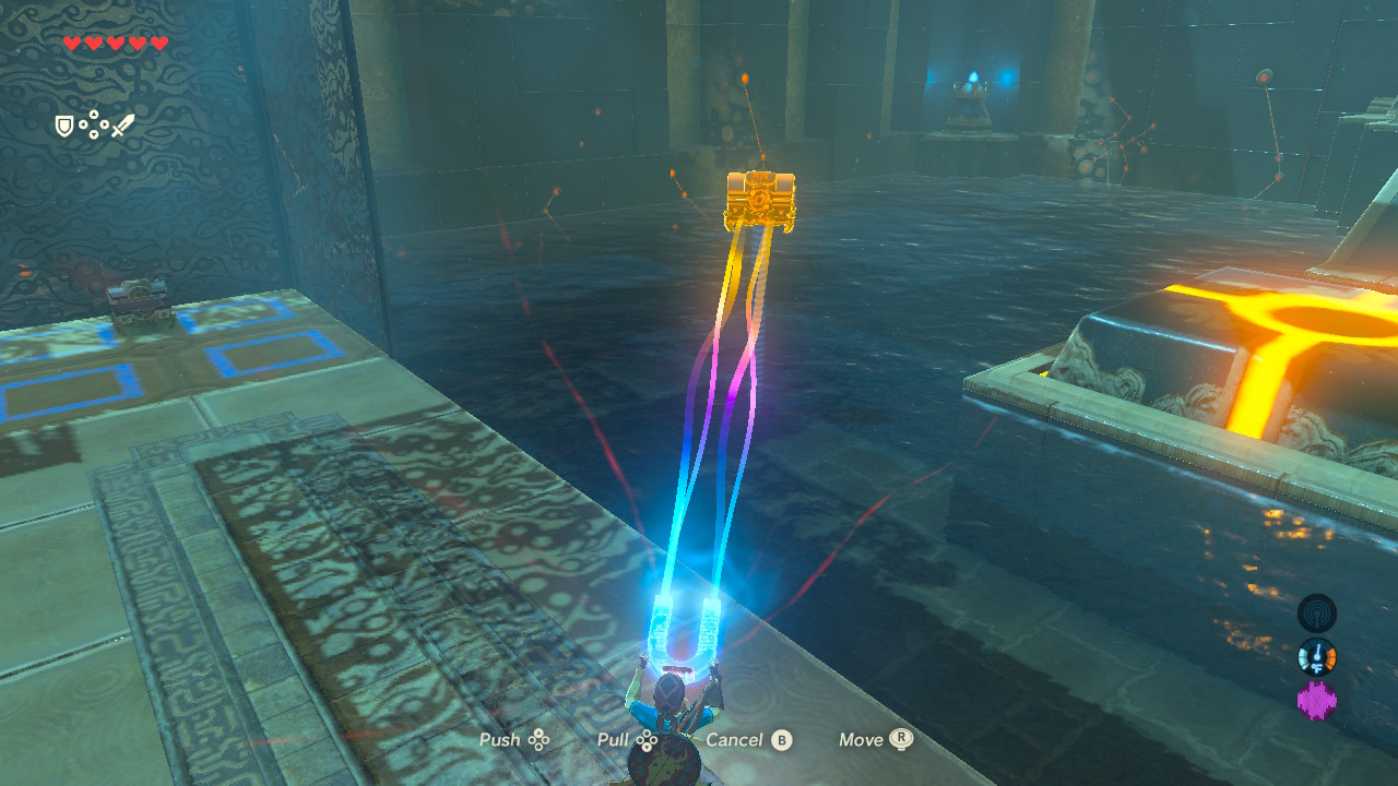Grab all three with Magnesis and place them on the giant button. The combined weight will actually push the button, opening the gate opposite the elevator. Grab the metal box and use it to reach the highest ledge when the elevator platform rises.
