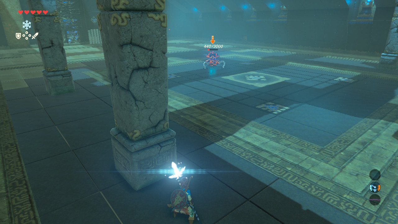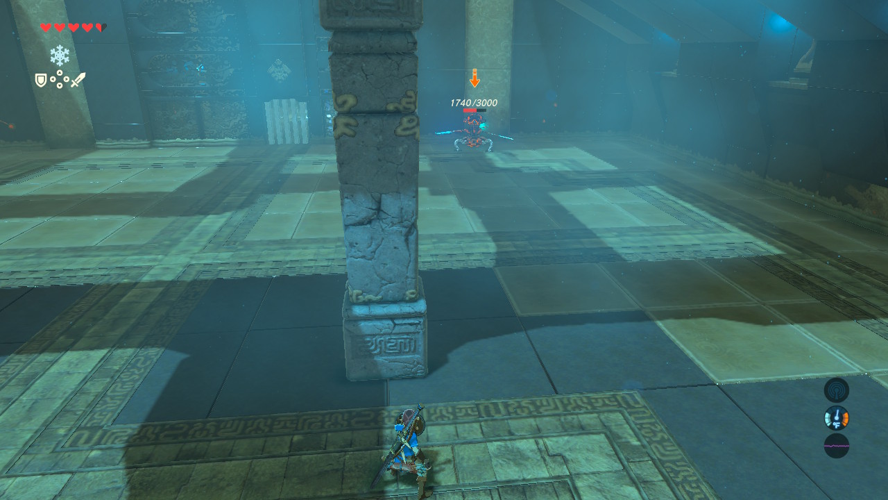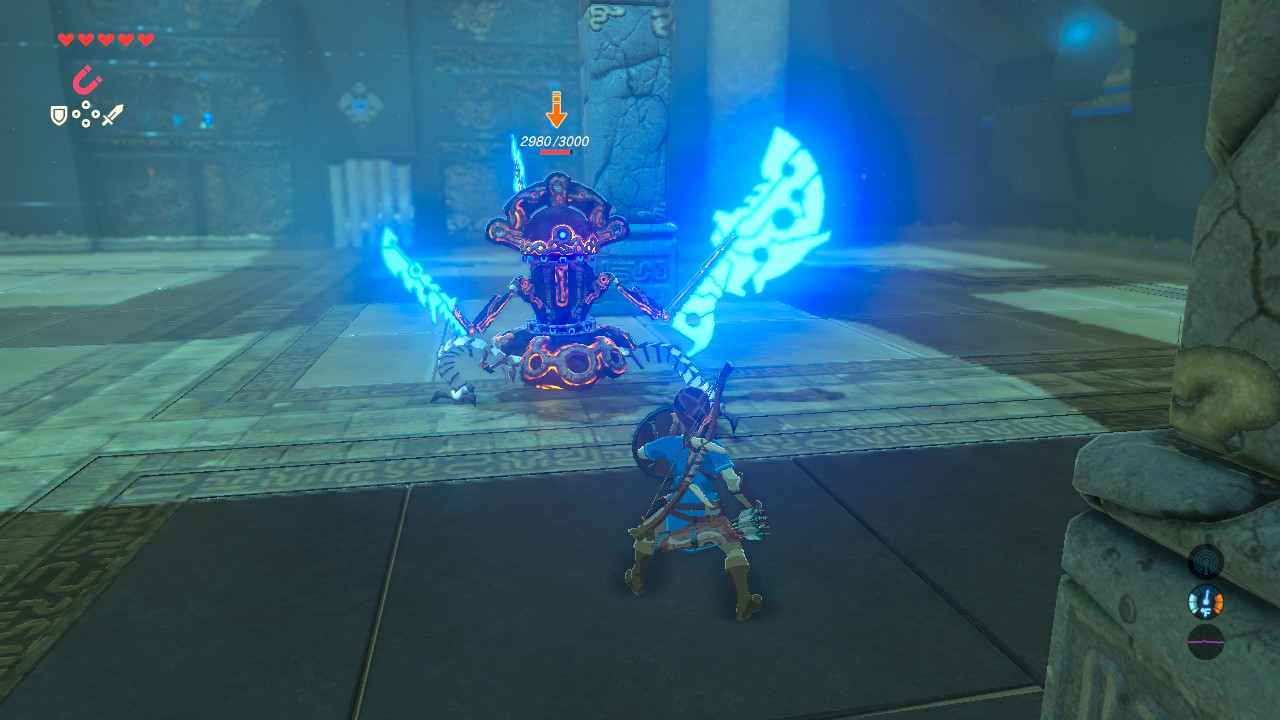 To safely deal with the Scout, use ice-weapons to freeze then attack with your strongest weapon. A combo, or charged combo, will help — and breaking ice deals triple normal damage. If it uses a spinning blue laser, use the wind to paraglide over it and unleash a jump-attack.