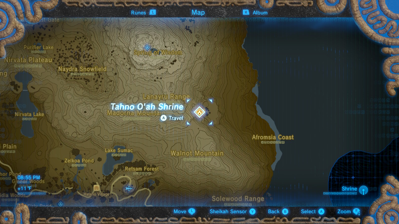 Find this hidden shrine on a small flat area on the eastern face of Mount Lanayru. Look north of the Walnot Mountain peak — there’s a rock wall you can bomb to access the shrine.